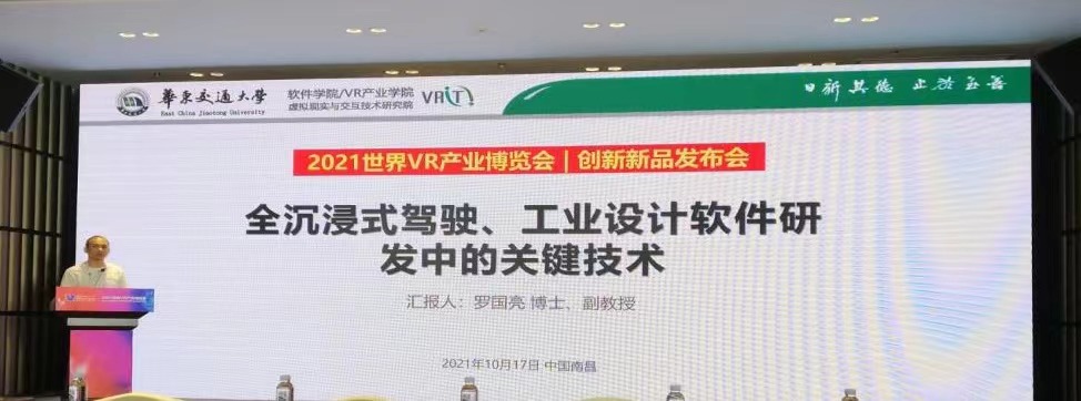 WilliamHill官网软件学院(VR产业学院)副院长罗国亮在2021世界VR产业博览会创新新品发布会上介绍全沉浸式公交驾驶系统。
