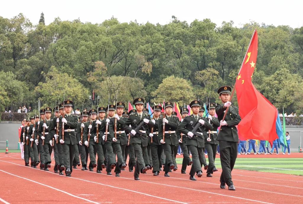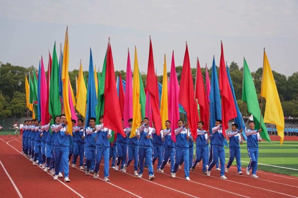 伴着激昂的《运动员进行曲》,国旗队、校旗队、彩旗队和17个师生方阵队依次入场,他们精神抖擞,步履铿锵,喊着响亮的口号,昂首阔步向主席台走来,展现出蓬勃朝气与青春飞扬。入场结束后,在庄严肃穆的国歌旋律中,五星红旗冉冉升起,全场师生行注目礼,齐唱国歌。