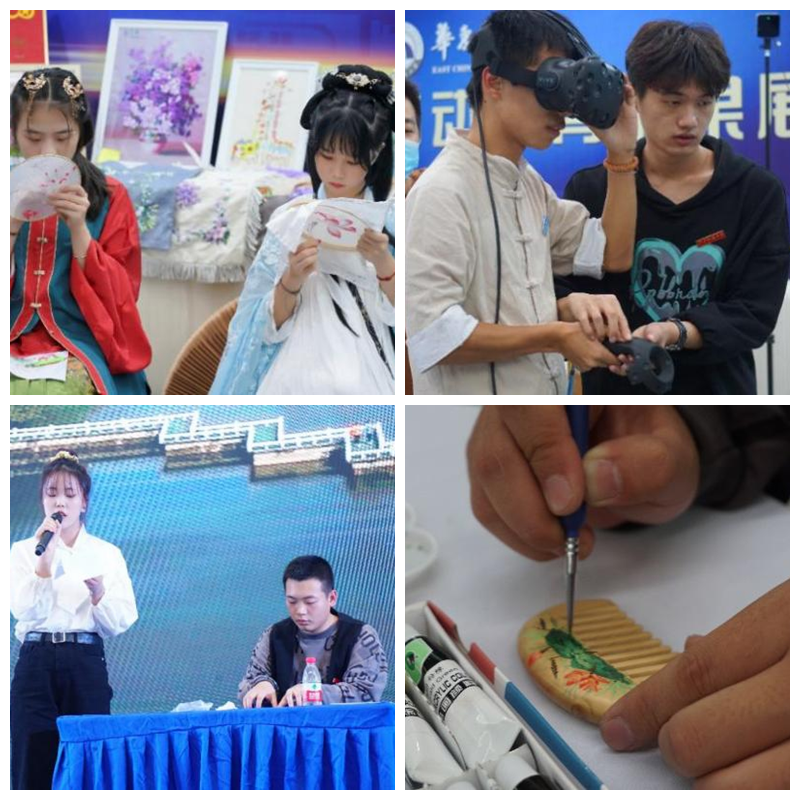艺术学院仉春辉、丁磊,人文学院阮学云等老师将中华优秀传统文化和党史学习教育相结合,充分挖掘红色文化、传统工艺、民间技艺、非遗传承等文化元素,指导学生创作了木梳、浮雕及刺绣、钩针、刻纸等作品。身着古装的学生现场进行工艺操作展示,吸引了众多参观者驻足欣赏、拍照。艺术学院夏海斌老师指导学生利用虚拟仿真技术,模拟出完整、逼真的八大山人VR系统,观众可通过穿戴设备参观景点、临摹书法等,参观者纷纷前来展区亲身体验。智能配送无人机,水下管道智能巡检机器人,热能驱动自主避障小车……结合产业新业态、劳动新形态,实训中心展示了学生在工程训练综合能力大赛中的劳动作品。
