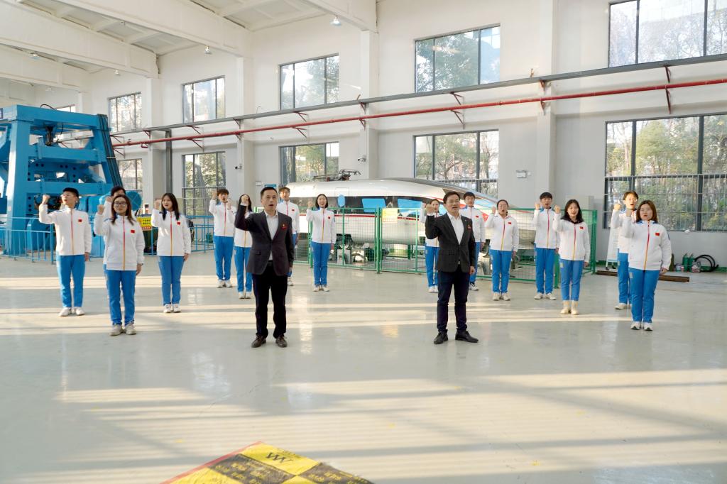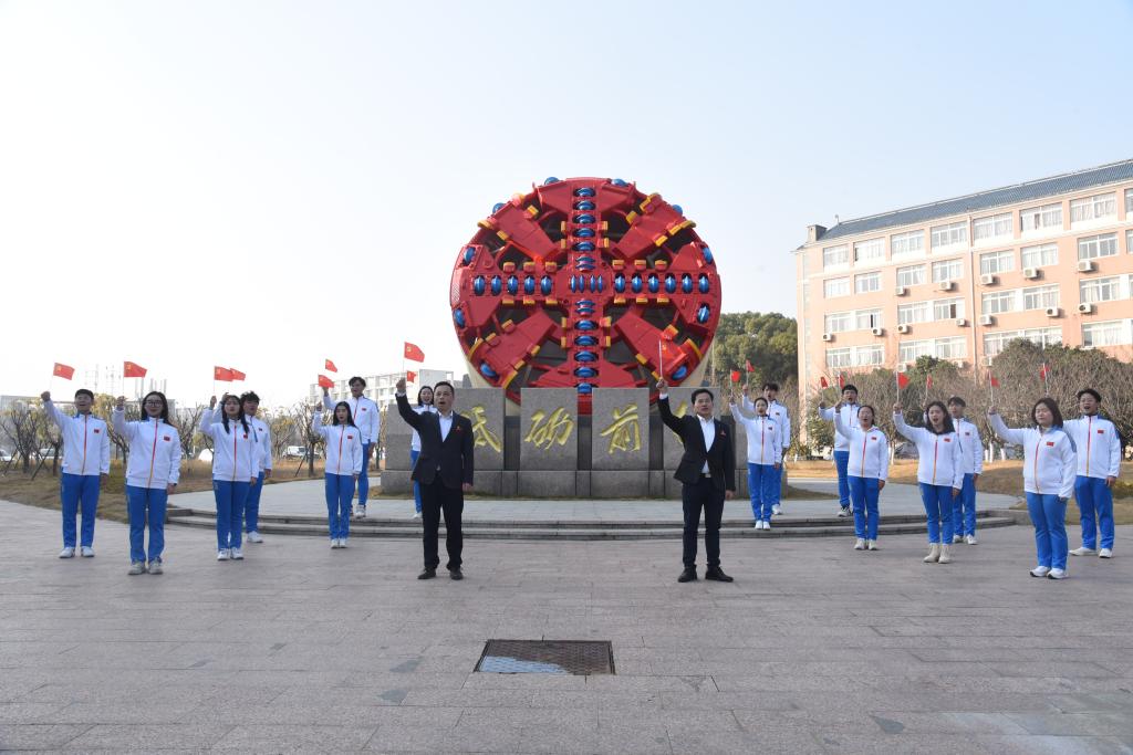 WilliamHill官网师生在学校中心广场、轨道交通基础设施性能监测与保障国家重点实验室、盾构机实体雕塑传唱《领航》。