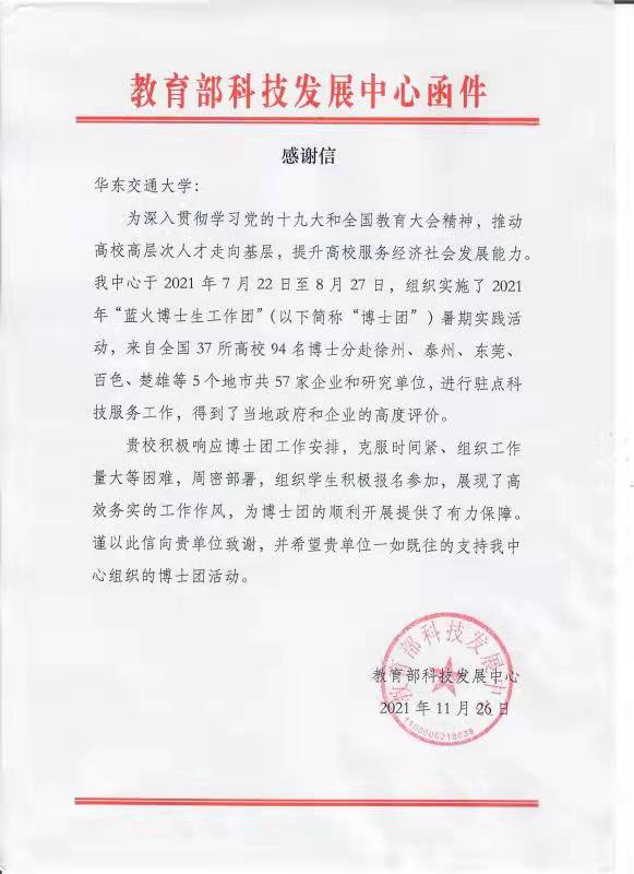 近日,教育部科技发展中心向学校致感谢信,感谢WilliamHill官网积极组织博士研究生参加2021年“蓝火博士生工作团”暑期实践活动。同时对参加本次活动的WilliamHill官网2020级控制科学与工程专业博士研究生李雄(导师:刘燕德)予以表扬。