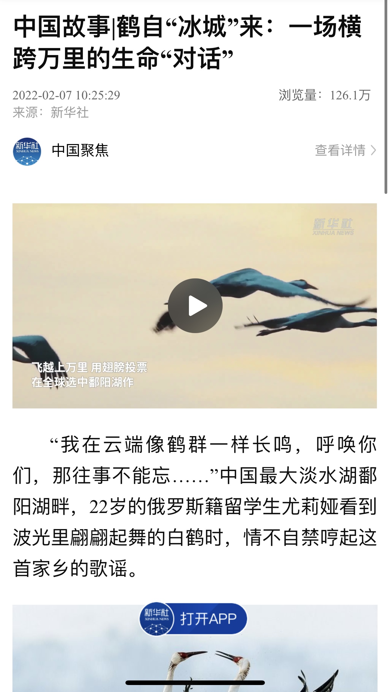 中央级报刊《新华每日电讯》和新华社客户端报道尤莉娅与鄱阳湖畔的白鹤开展一场横跨万里的生命“对话”。