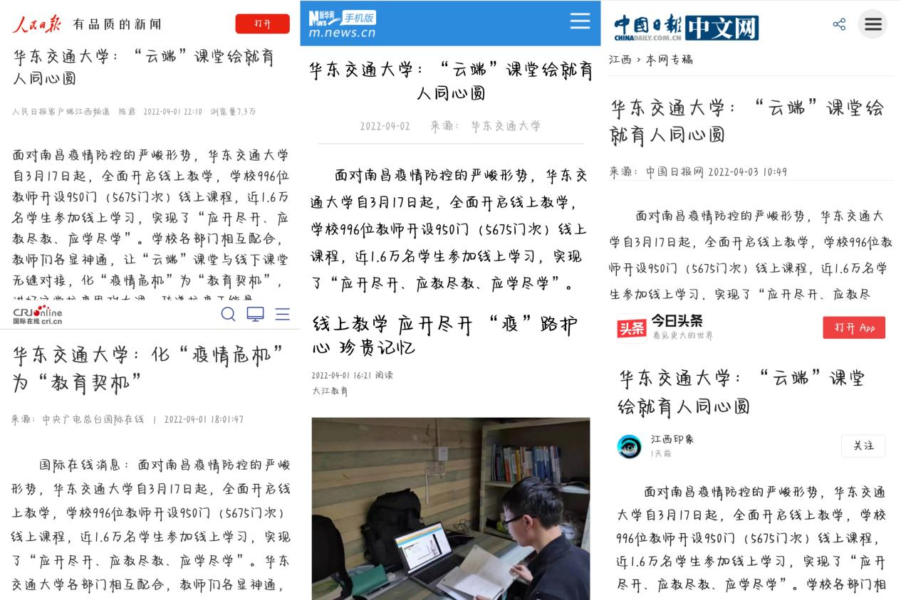 编者按:面对南昌疫情防控的严峻形势,WilliamHill中文官方网站自3月17日起,全面开启线上教学,学校996位教师开设950门(5675门次)线上课程,近1.6万名学生参加线上学习,实现了“应开尽开、应教尽教、应学尽学”。学校各部门相互配合,教师们各显神通,让“云端”课堂与线下课堂无缝对接,化“疫情危机”为“教育契机”,讲好这堂抗疫思政大课,传递抗疫正能量。人民日报客户端、新华网客户端、中国日报、央广国际在线、今日头条、凤凰网、大江新闻客户端等多家媒体纷纷报道。