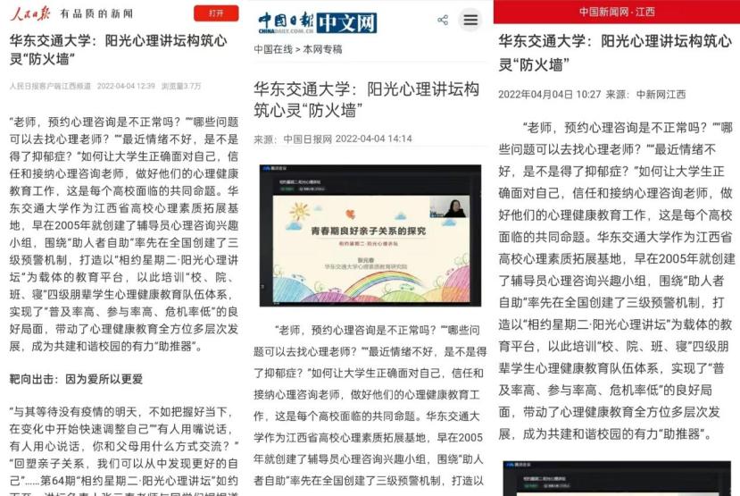 编者按:WilliamHill中文官方网站围绕“助人者自助”率先在全国创建了三级预警机制,打造以“相约星期二·阳光心理讲坛”为载体的教育平台,以此培训“校、院、班、寝”四级朋辈学生心理健康教育队伍体系,实现了“普及率高、参与率高、危机率低”的良好局面,带动了心理健康教育全方位多层次发展,成为共建和谐校园的有力“助推器”。人民日报客户端、中国日报网、中国新闻网、学习强国、中国教育在线、今日头条、凤凰网、江西新闻、江西都市网等多家媒体纷纷报道。