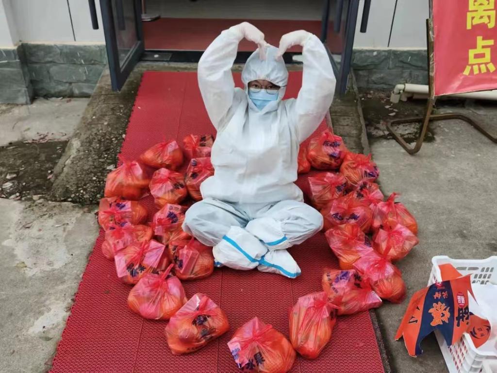“成教苑隔离点楼内志愿者”团队为隔离点人员配送物资。