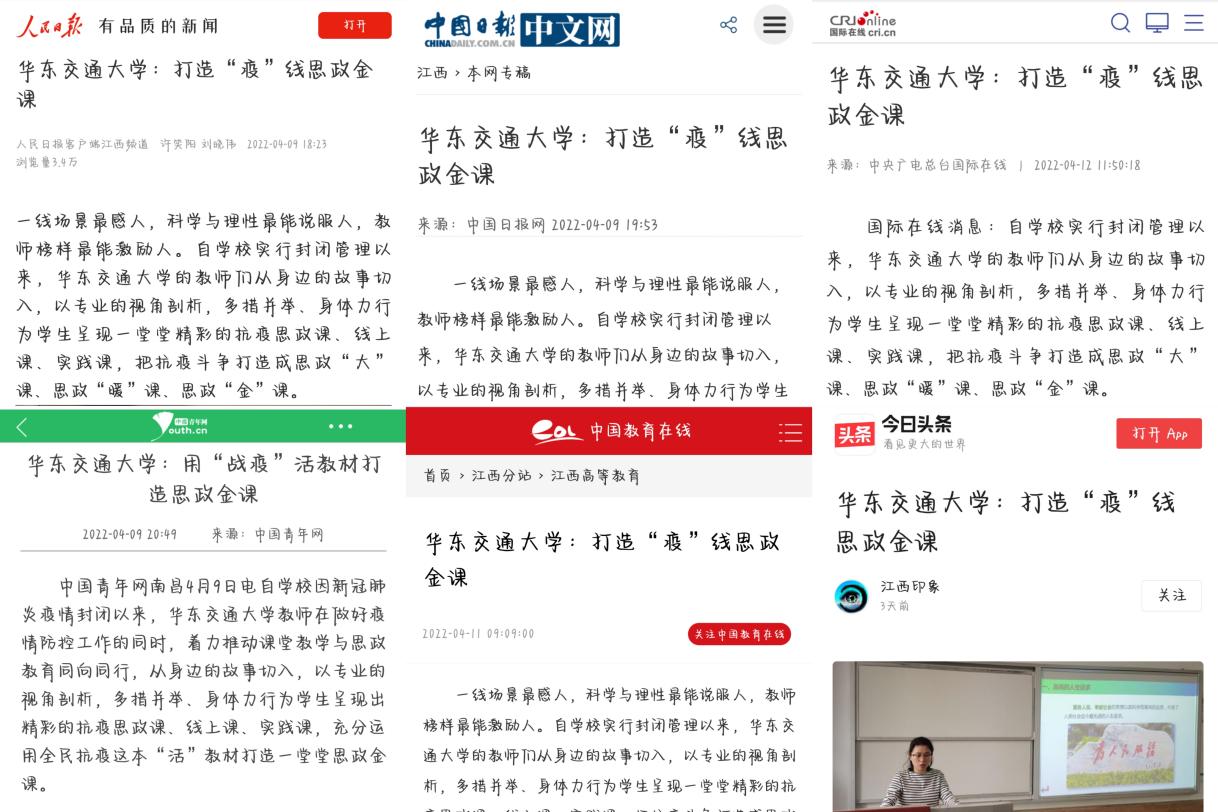 编者按:一线场景最感人,科学与理性最能说服人,教师榜样最能激励人。自学校实行封闭管理以来,WilliamHill中文官方网站的教师们从身边的故事切入,以专业的视角剖析,多措并举、身体力行为学生呈现一堂堂精彩的抗疫思政课、线上课、实践课,把抗疫斗争打造成思政“大”课、思政“暖”课、思政“金”课。人民日报客户端、中国日报网、央广国际在线、中国青年网、中国教育在线、今日头条、凤凰网、大江新闻客户端等多家媒体纷纷报道。