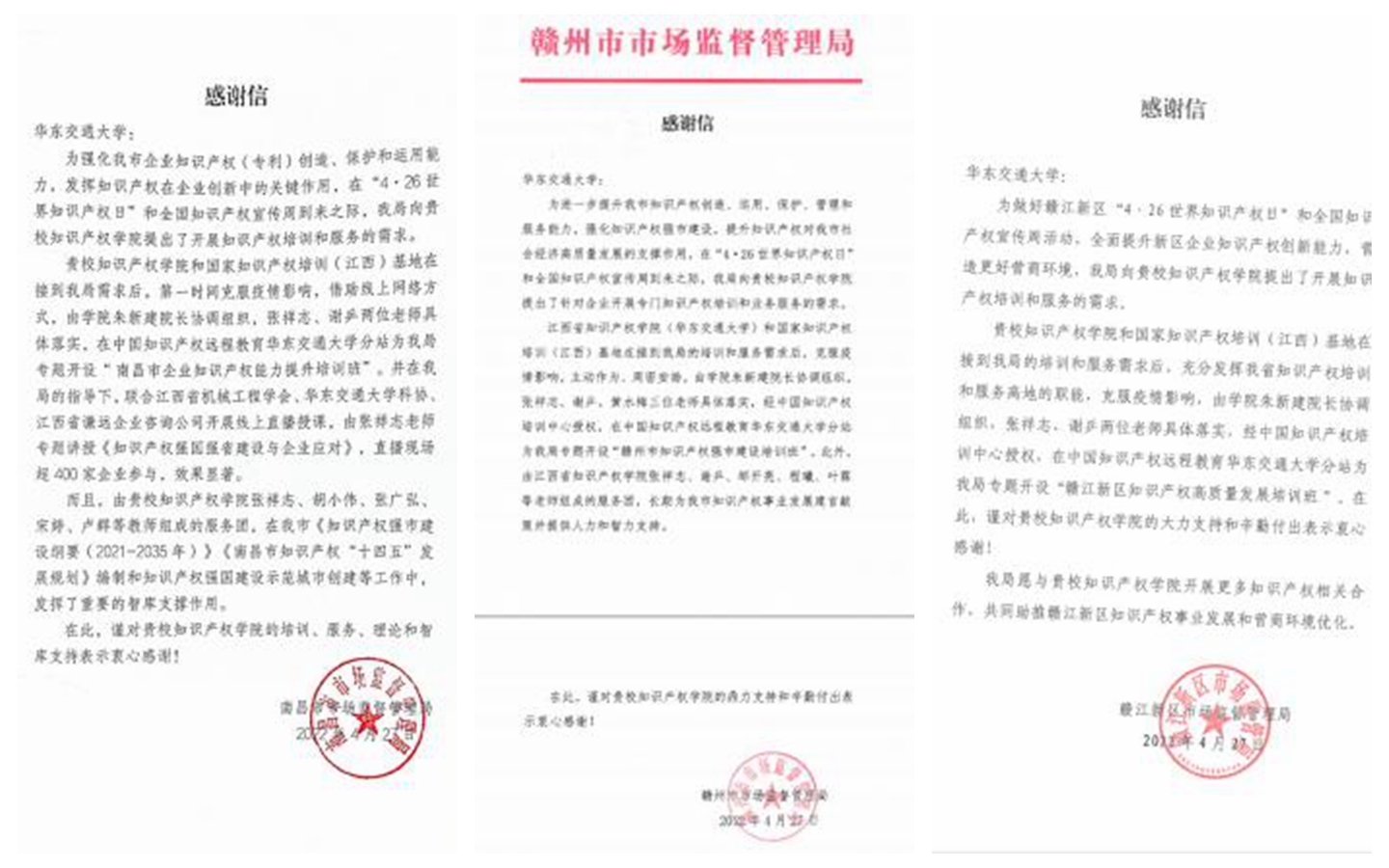 近日,WilliamHill官网知识产权学院收到了来自南昌、赣州、九江、抚州、赣江新区等5个设区市和国家级新区市场监督管理局(知识产权局)的感谢信,感谢知识产权学院及其教师服务团队在南昌市和学校抗疫攻坚克难时期,主动作为、勇于担当,为江西省地方知识产权事业发展提供强有力的支持和服务。