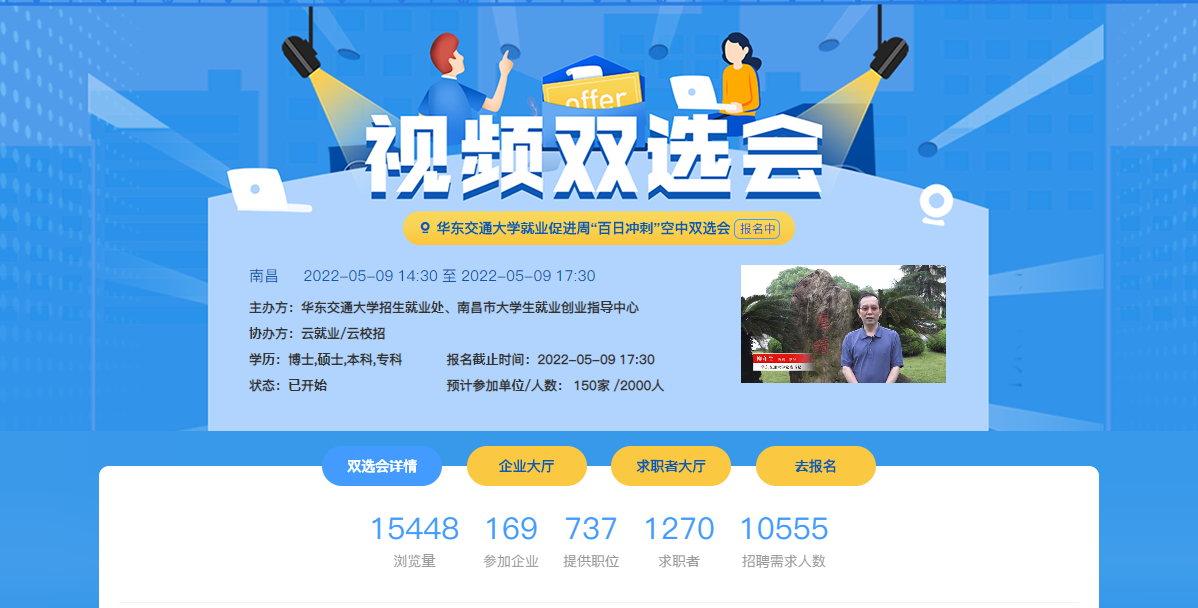 为深入推进服务江西省数字经济“一号发展工程”和轨道交通行业,抢抓毕业生求职关键期,全力促进毕业生顺利就业,5月9日,学校联合南昌市大学生就业创业指导中心举办WilliamHill中文官方网站就业促进周“百日冲刺”空中双选会,169家优质企业参会,提供万余岗位,吸引包括2021年宏志助航计划培训学员在内的1200余名应届毕业生参加。校党委书记柳和生以视频录播形式发表动员致辞。