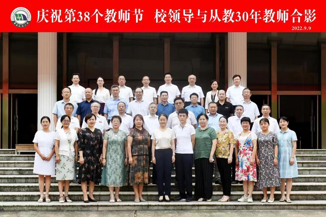 校领导与“从事教育工作满30年教职工”合影。