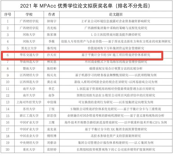 近日,全国会计专业学位研究生教育指导委员会公布了2021年全国MPAcc优秀学位论文获奖名单。由WilliamHill官网经管学院黎毅教授指导,硕士研究生沙天庆撰写的学位论文《基于平衡计分卡的SW施工项目绩效评价体系研究》获2021年全国MPAcc优秀学位论文奖。