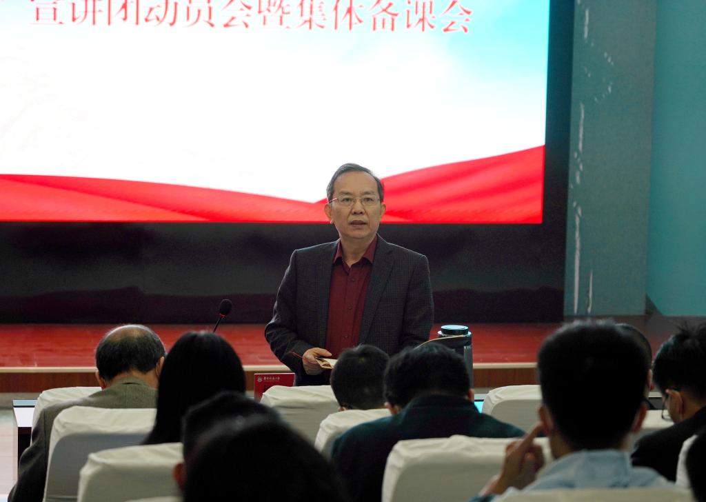 柳和生指出,宣讲团的成员是学校党委精挑细选出来的,党的二十大精神能否在学校干部师生中入脑入心,在很大程度上取决于宣讲团成员的宣讲成效。他强调,宣讲好、宣传好党的二十大精神,宣讲团成员责任重大、使命光荣,要以高度的政治责任感和饱满的政治热情,全力以赴做好宣讲工作。