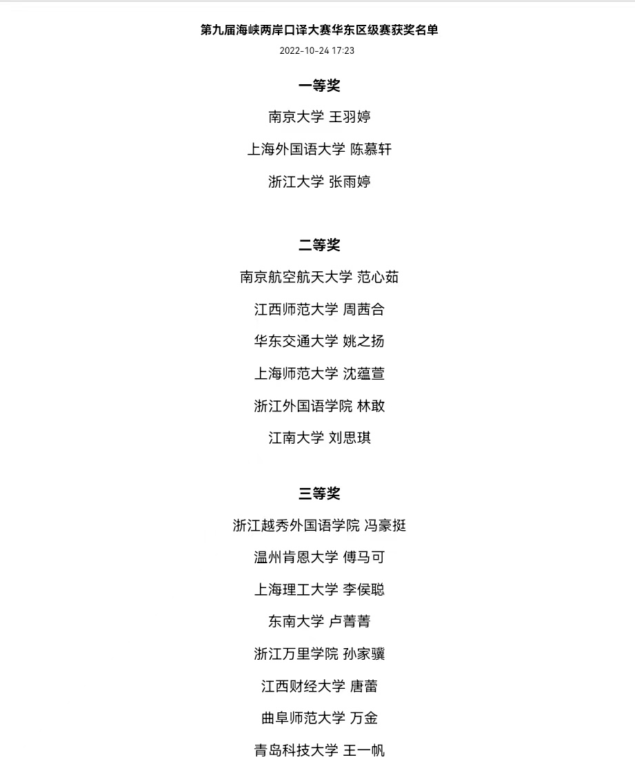 WilliamHill官网学生获第九届海峡两岸口译大赛华东赛区二等奖。