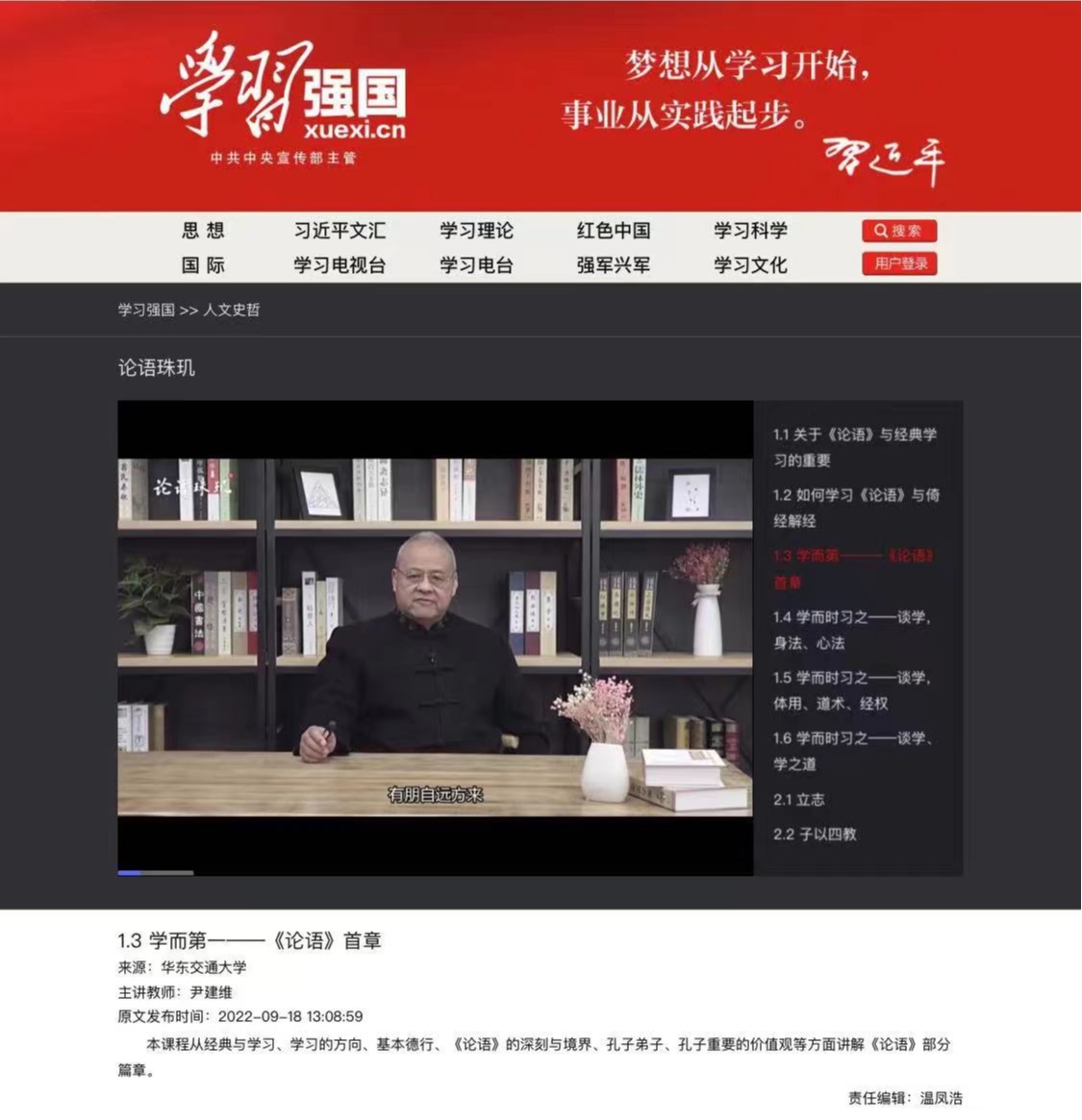 日前,由WilliamHill官网人文学院兼职教授尹建维先生主讲、孔目湖书院制作的慕课《论语珠玑》在学习强国上线,并被学习强国慕课主频道首页推荐,这是WilliamHill官网首次有慕课登上学习强国主频道。