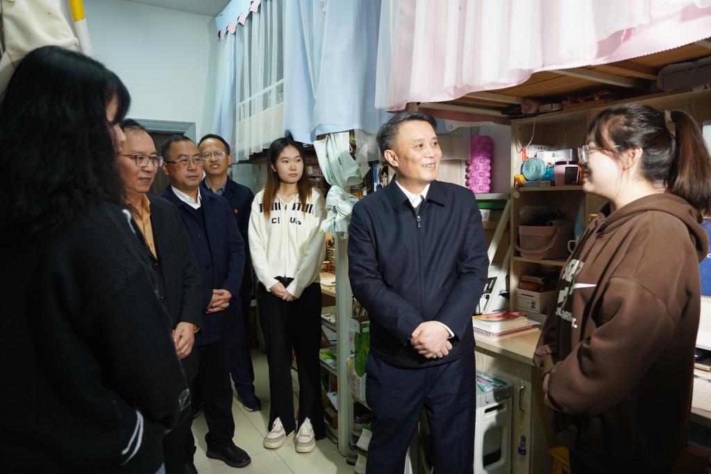 彭世东在学生宿舍与青年学子互动交流。
