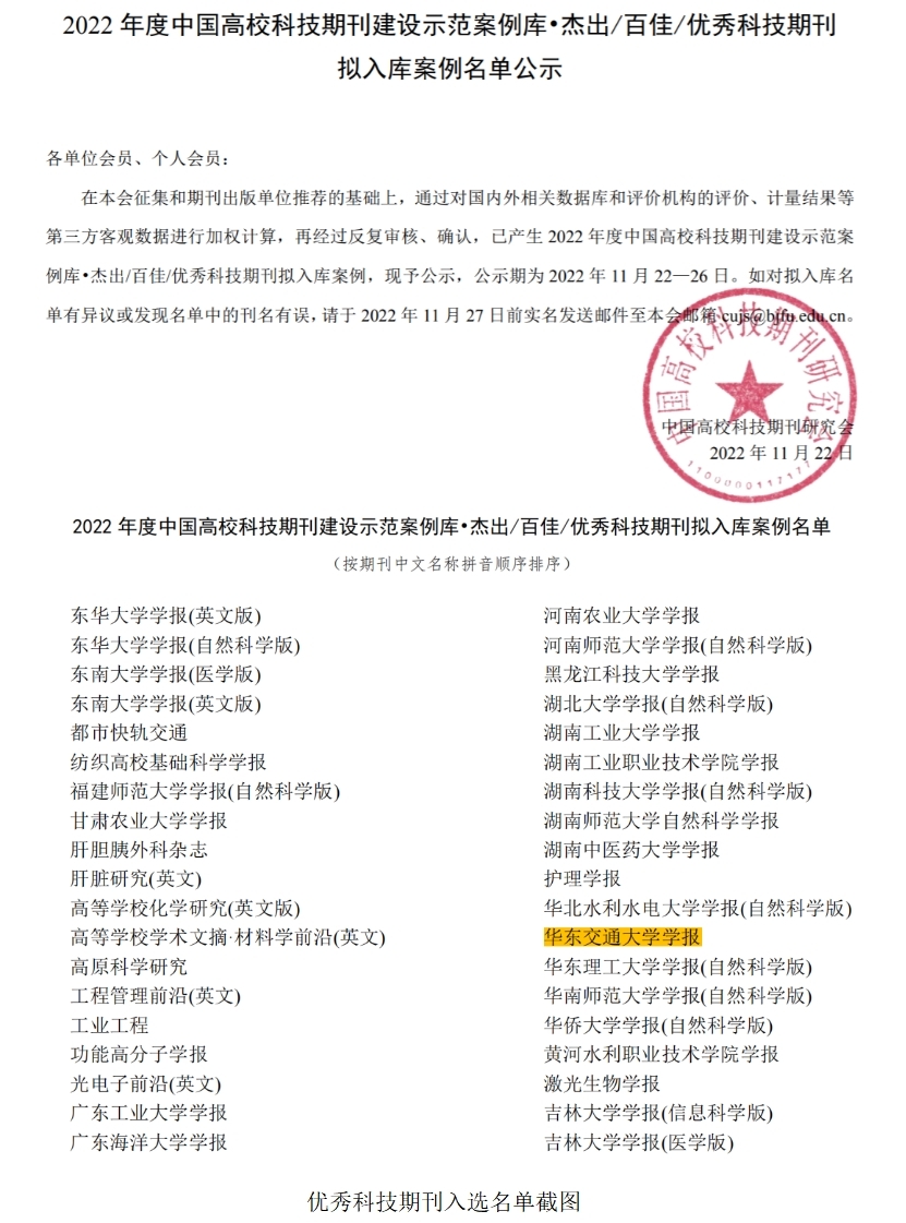 此外,中国高校科技期刊研究会公示了2022年度中国高校科技期刊建设示范案例库•杰出/百佳/优秀科技期刊拟入库案例名单,《学报》成功入选为优秀科技期刊拟入库名单(省内仅有3所高校学报入选),同时《学报》副编审姜红贵的论文入选“2022年度中国高校科技期刊建设示范案例库·银笔论著”(省内唯一)。