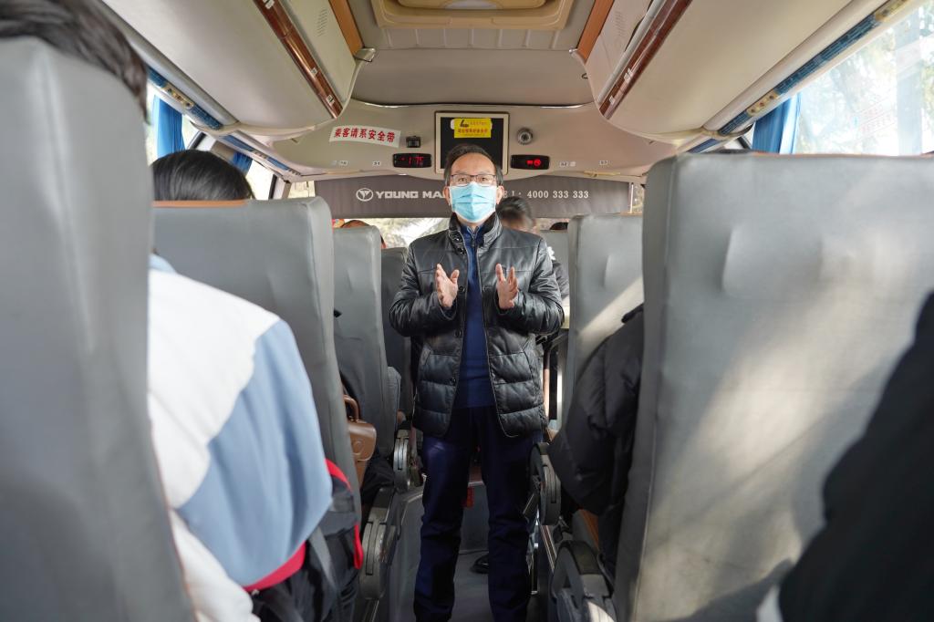 在北区乘车点,徐长节来到大巴上,嘱托同学们放假不放松,学习“不打烊”,要认真完成网课学习。他希望大家保重身体,来年以更加饱满的热情投入学业,为未来而奋斗。