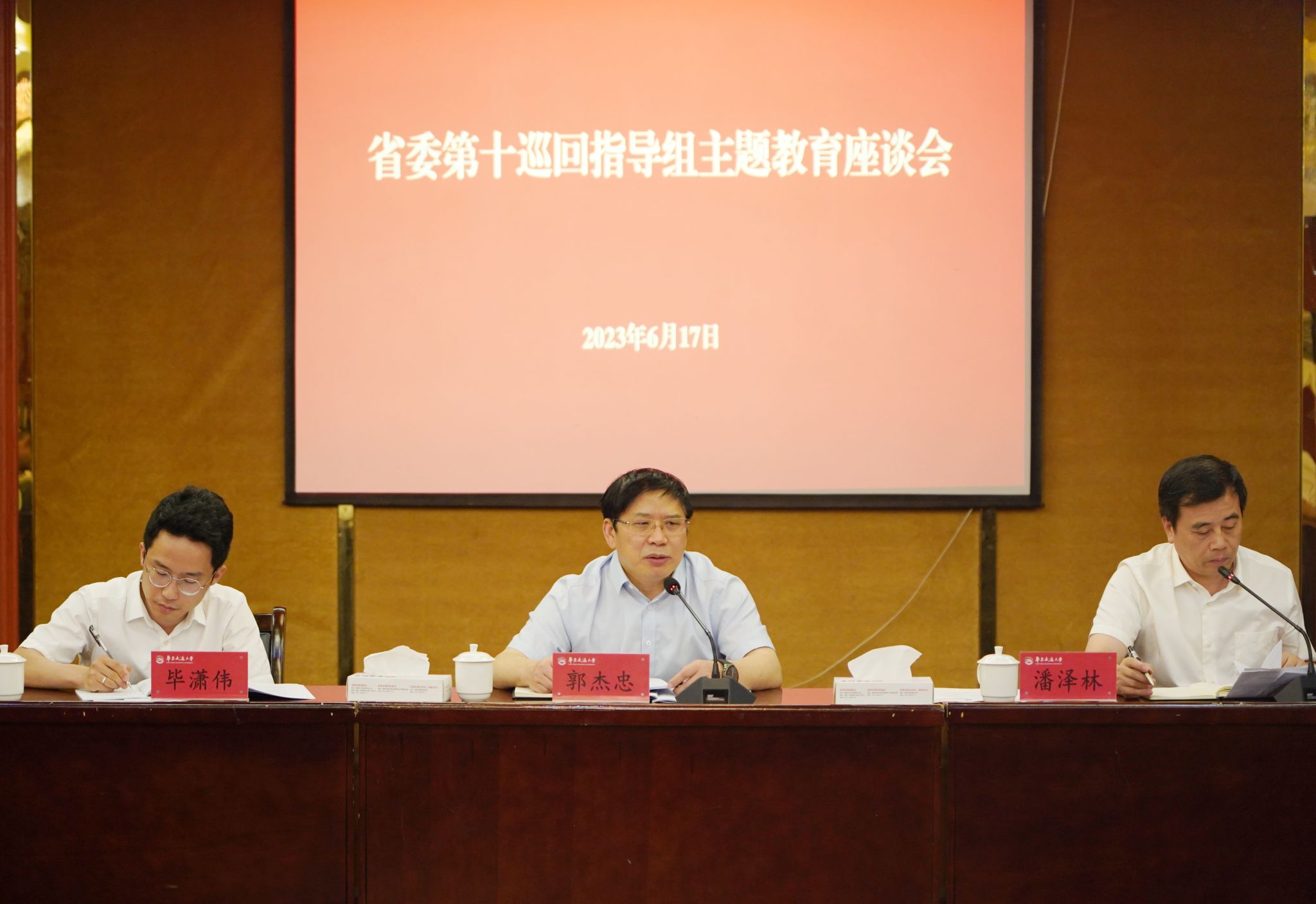 郭杰忠结合被指导高校主题教育进展情况,就进一步落实好主题教育各项任务提出五点意见。一是要强化理论学习,吃透党中央精神,把习近平总书记重要讲话和重要指示批示精神全面系统学习好、融会贯通领会好,深刻把握核心要义、精神实质、实践要求,坚持学思用贯通、知信行统一,坚持联系实际、立足岗位,直面问题本质,缺什么就重点补什么,通过学习不断补齐短板弱项。二是要注重分类指导,压紧压实责任,领导干部要切实担负起主体责任,坚持带头学、带头讲、带头干,以更快速的行动、更严实的作风,全力推动各项工作尽快取得明显成效,形成以上率下、整体联动的生动局面,以干部好作风营造学校好校风、教师好教风、学生好学风。三是要着力解决问题,聚焦师生关切,突出问题导向,敢于触碰痛点难点堵点,引导党员、干部以深化调查研究解决发展难题,把问题整改整治贯穿始终,立查立改,解决真问题、真解决问题,坚持“当下改”与“长久立”相结合,做好建章立制,持续跟踪问效,确保常态长效。四是要加强统筹协调,切实推动主题教育融入日常、抓在经常。要提前谋划好暑期工作,确保主题教育正常有序推进。要有责任意识,时刻绷紧暑期校园安全和食品安全这根弦。五是要坚决防止不良倾向,科学研判、及时纠偏,力戒形式主义、官僚主义,在改进工作、推动发展上下功夫,高质量推进主题教育走深走实。(马莉娅 摄)