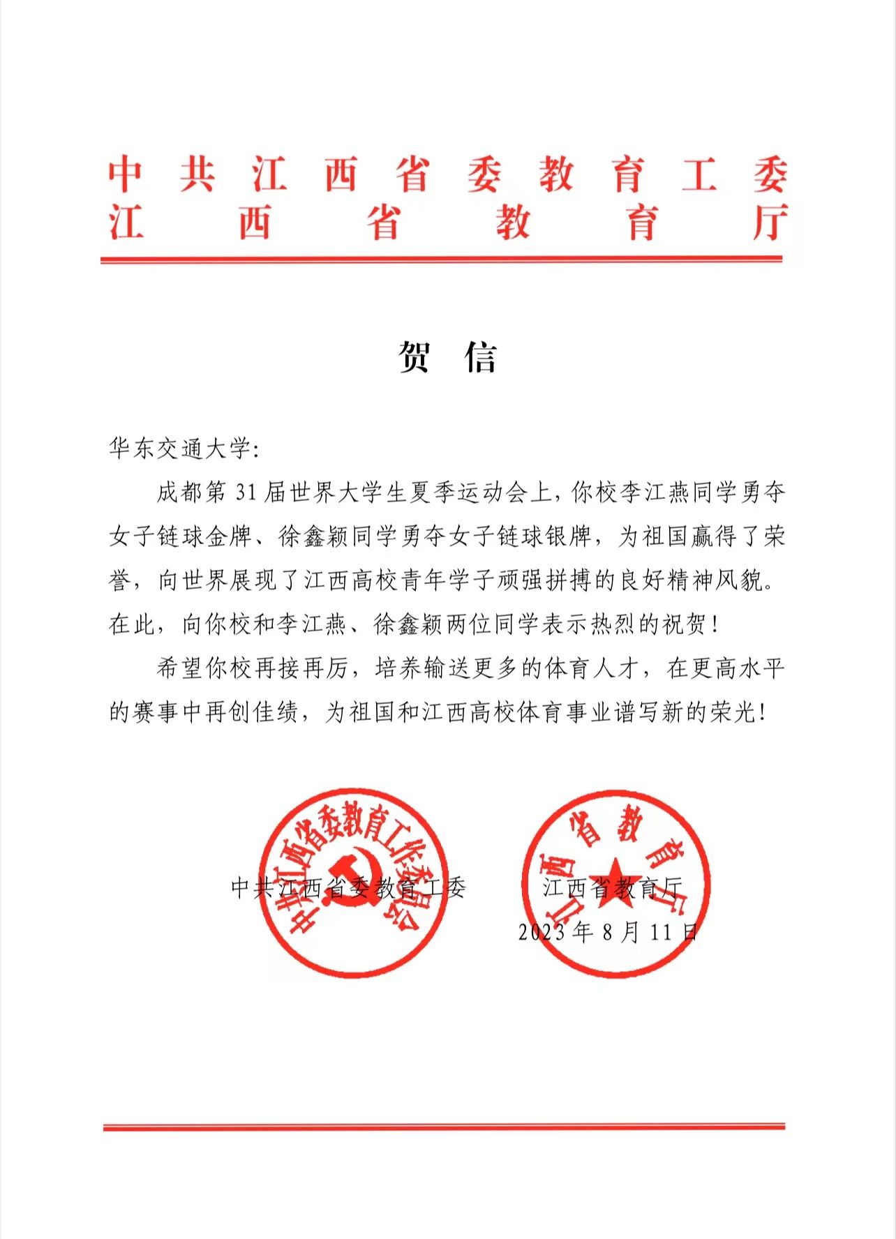 贺信向WilliamHill中文官方网站和李江燕、徐鑫颖两位同学表示热烈的祝贺,希望学校再接再厉,培养输送更多的体育人才,在更高水平的赛事中再创佳绩,为祖国和江西高校体育事业谱写新的荣光。