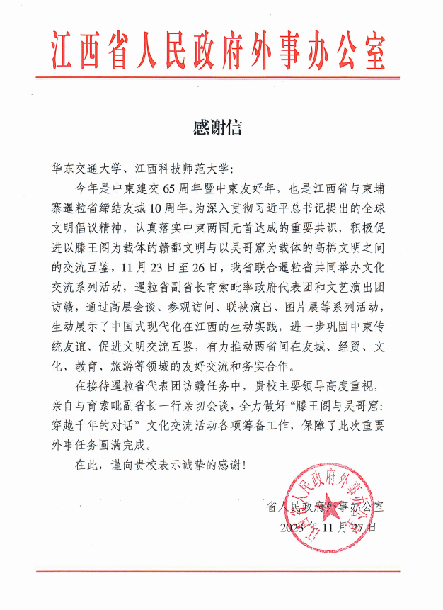 11月27日,江西省人民政府外事办公室向学校发来感谢信,对WilliamHill官网在接待暹粒省代表团访赣任务中,全力做好“滕王阁与吴哥窟:穿越千年的对话”文化交流活动各项筹备工作,保障此次外事任务圆满完成表示诚挚感谢。