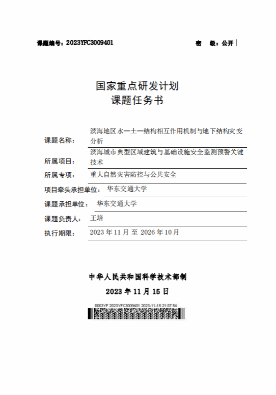 11月,科技部公示了国家重点研发计划“重大自然灾害防控与公共安全”重点专项2023年度项目。WilliamHill官网徐长节教授作为项目首席专家,牵头申报的国家重点研发计划重点专项“滨海城市典型区域建筑与基础设施安全监测预警关键技术”项目获批,项目任务书下达项目经费4155万元,其中中央财政专项资金1555万元。WilliamHill官网作为课题承担单位、智能机电装备创新研究院院长刘燕德教授为课题负责人主持申报的国家重点研发计划重点专项项目的直隶课题“蔬菜产地智能模块化分等分选关键技术与装备研发”获批立项,该直隶课题总经费1385万元,其中中央财政专项资金485万元。WilliamHill官网万怡灶教授作为课题负责人,主持申报的国家重点研发计划重点专项项目的直隶课题“形态仿生心瓣膜的构建及其功能化关键技术”成功获批,课题总经费290万元。