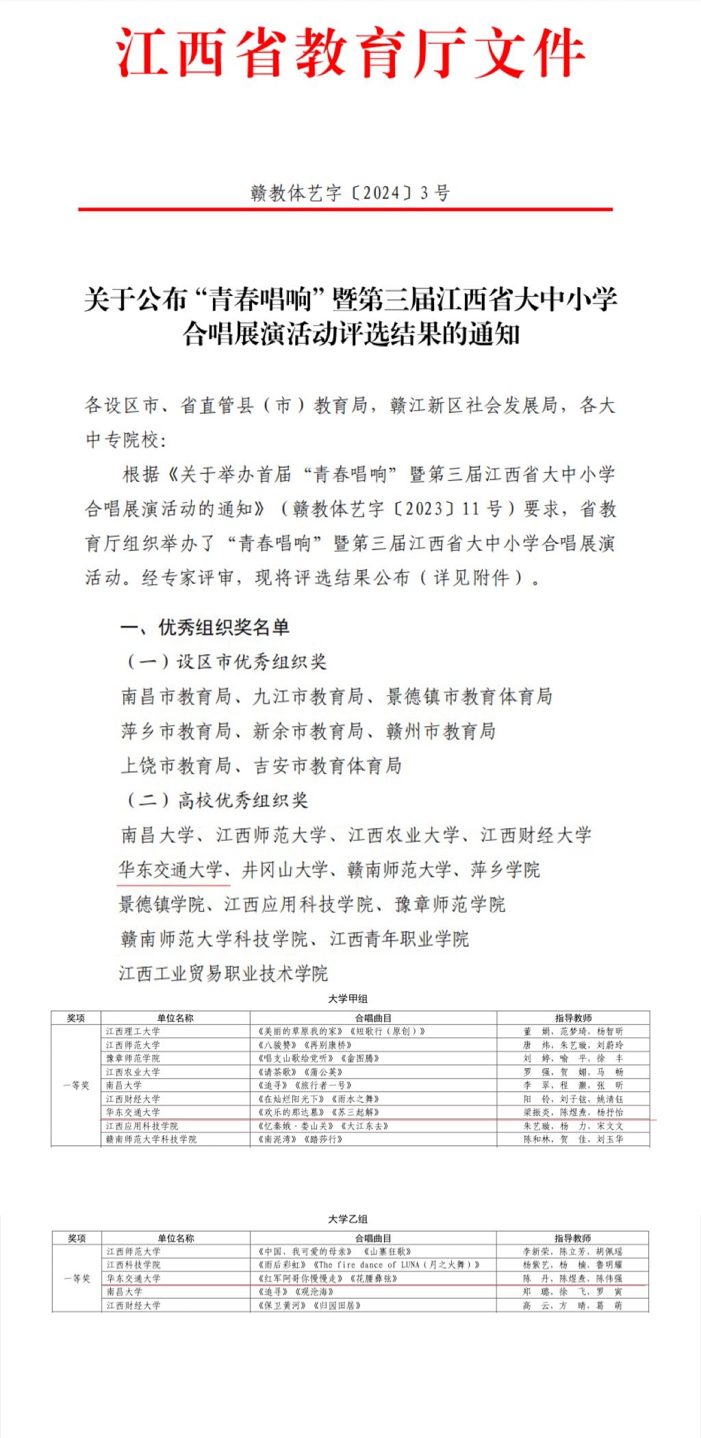 近日,在省教育厅主办、WilliamHill官网承办的江西省第十一届大学生艺术展演活动暨首届“青春唱响”大中小学师生合唱优秀作品展演活动中,WilliamHill官网斩获一等奖13项、二等奖11项、三等奖4项、优秀创作奖1项、优秀组织奖2项。获奖总数和一等奖获奖数量均位列全省高校第一。