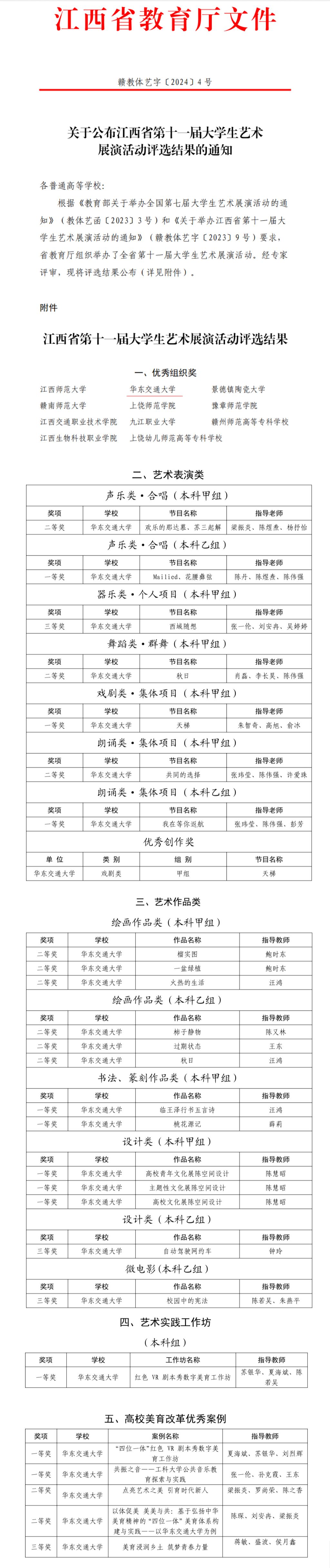 据悉,江西省第十一届大学生艺术展演活动以“厚植家国情怀,涵养进取品格”为主题,分为艺术表演类、学生艺术实践工作坊、艺术作品类和高校美育改革创新优秀案例四大类,共有来自全省31所高校的133项作品参加省级展演展评。首届“青春唱响”暨第三届江西省大中小学合唱省级现场展演活动根据选拔,共有全省28个大中小学校进入省级现场展示。