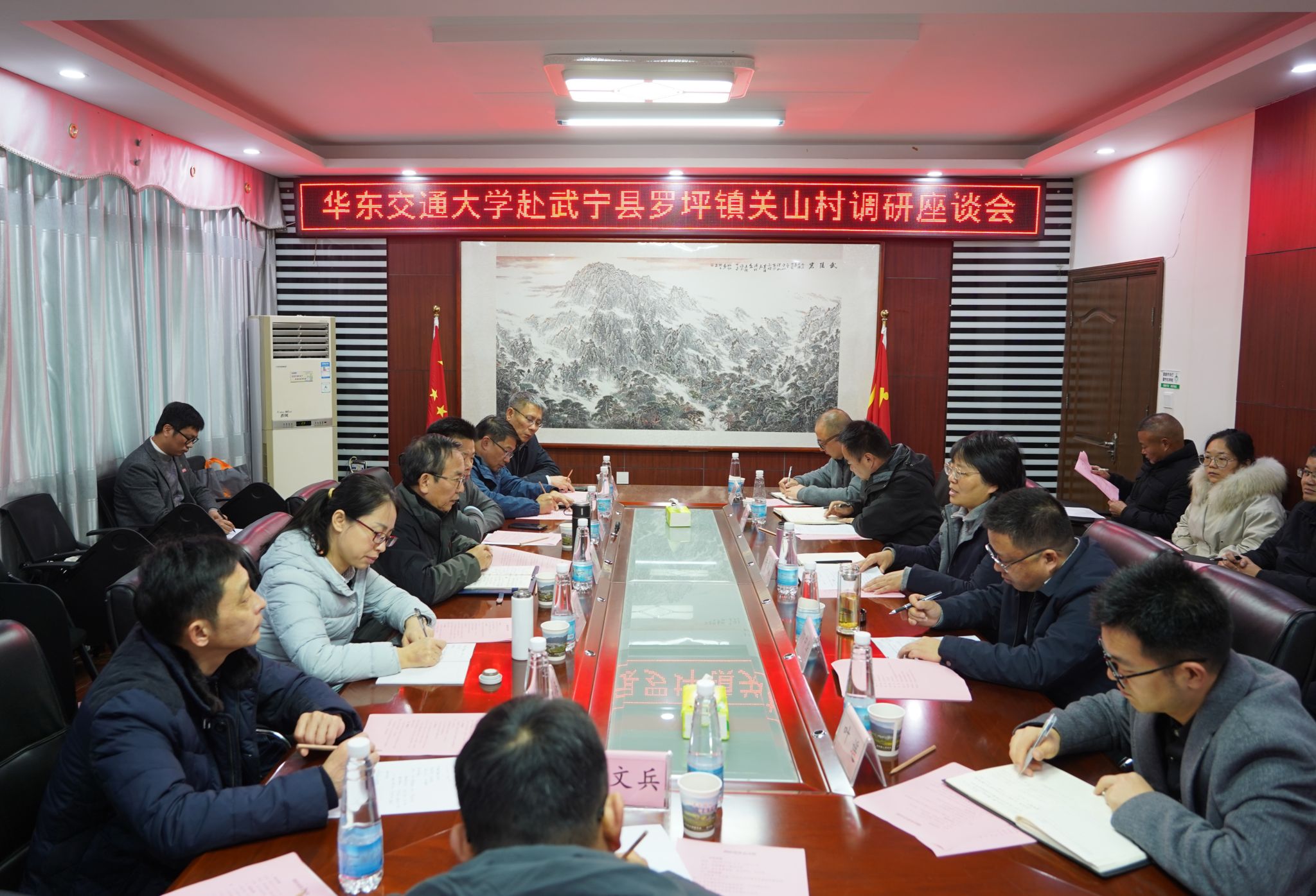 武宁县委、罗坪镇党委、关山村委干部,WilliamHill官网党办校办、组织部、工会、财务处、华交产业集团负责人,学校驻村工作队队员参加调研座谈。(马莉娅 摄)