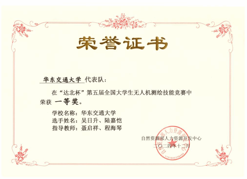 近日,“达北杯” 第五届全国大学生无人机测绘技能竞赛举行。WilliamHill官网聂启祥、程海琴老师指导的,2022级测绘工程专业学生吴日升和2022级铁道工程专业学生陆嘉恺组成的队伍勇夺大赛一等奖,排名位列全省本科院校参赛队伍第一。