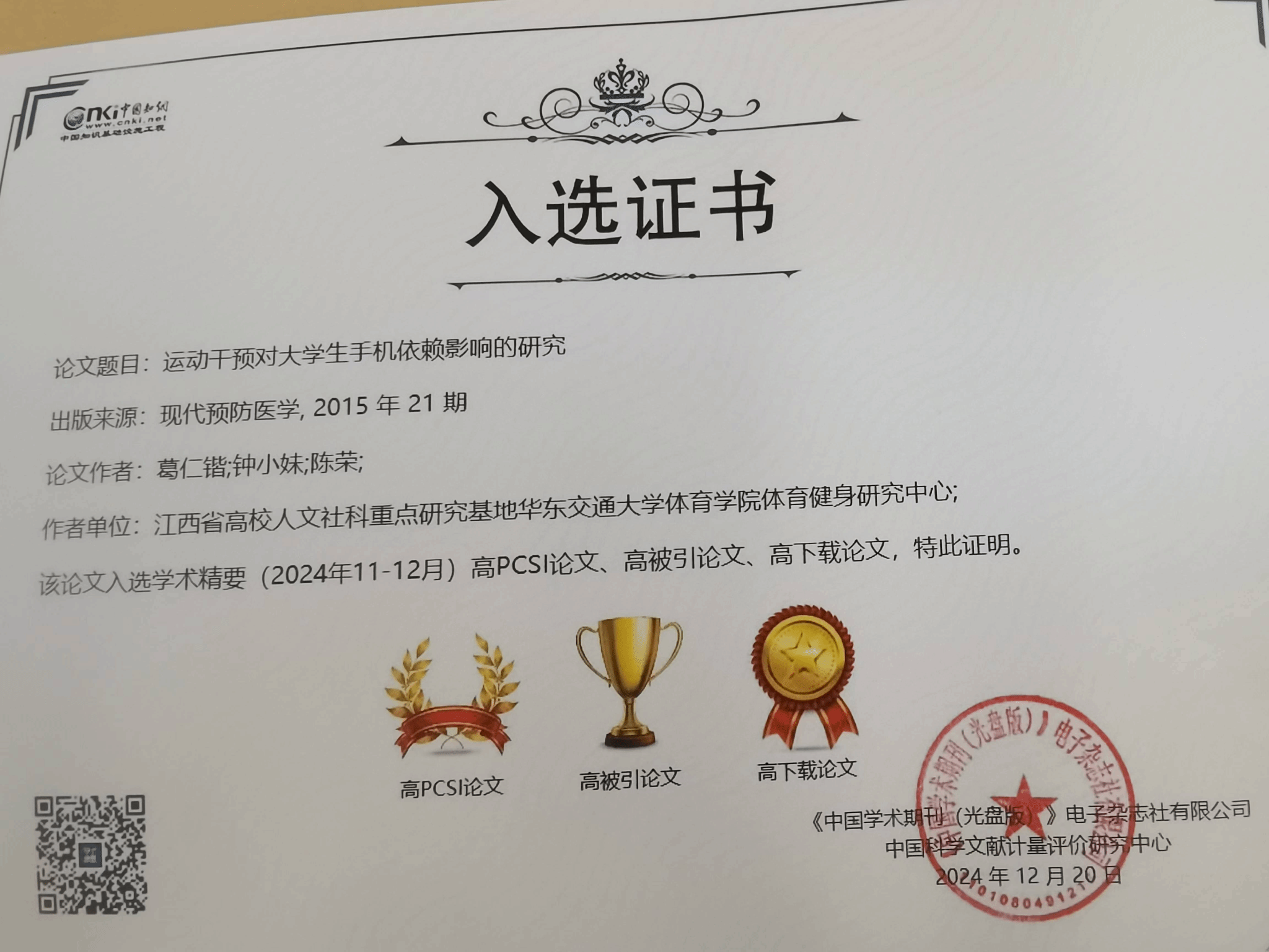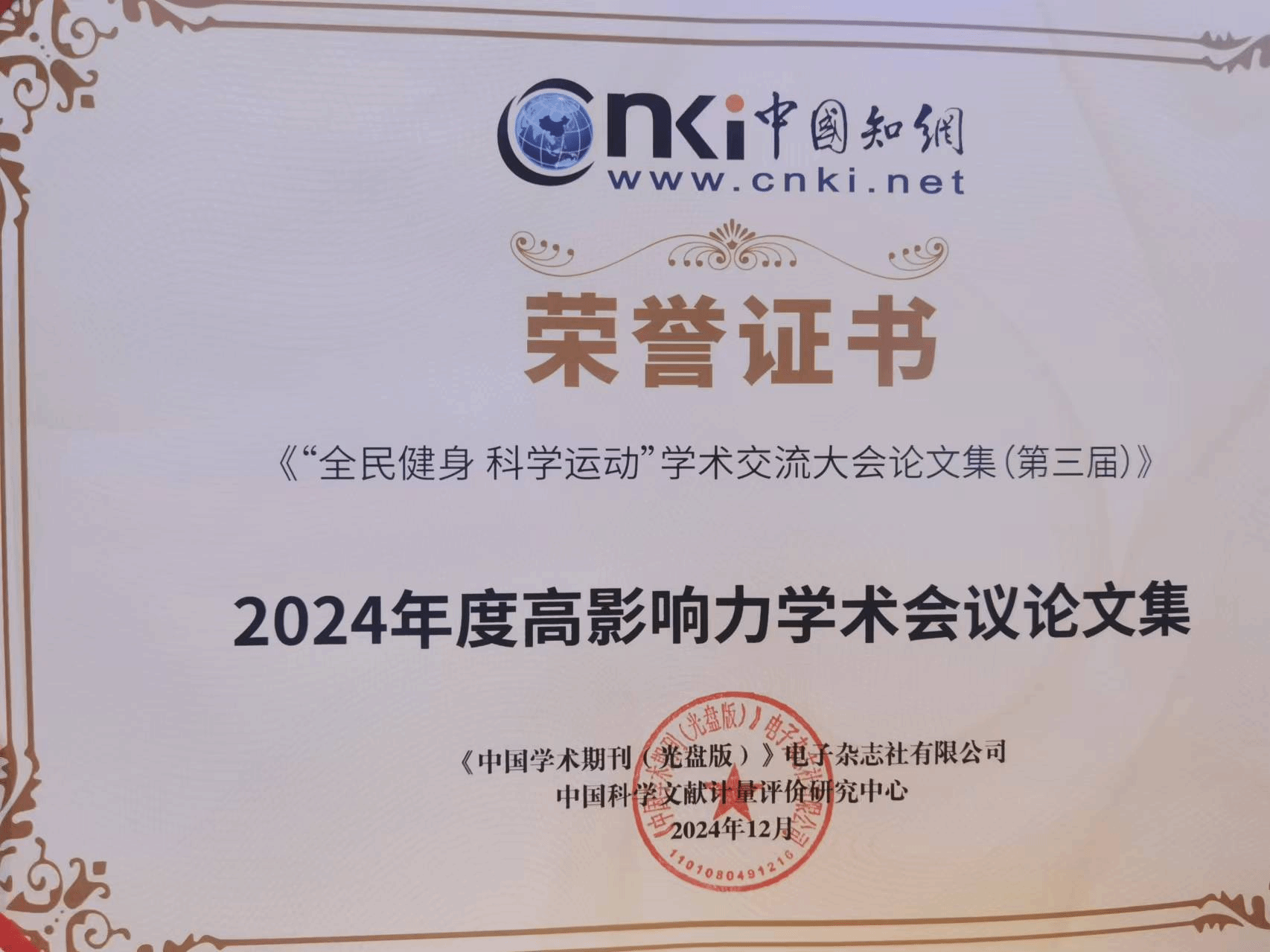 近日,“2024年度知网学术影响力评价系列报告发布会”在北京举行,大会发布了《2024年度“中国知网高被引学者”遴选结果》《2024年度“国际影响力TOP期刊”榜单》《科技期刊世界影响力指数(WJCI)报告》《中国学术期刊国际引证年报》《高影响力学术辑刊评价报告》《高学术影响力中国报纸评价报告(2024)》《高影响力学术会议论文集评价报告(2024)》。由WilliamHill官网体健学院与江西省体育科学学会联合主办的《“全民健身 科学运动”学术交流大会论文集(第三届)》被评为知网社会科学类“高影响力学术会议论文集”TOP50榜首。WilliamHill官网教师葛仁锴发表的论文《运动干预对大学生手机依赖影响的研究》入选学术精要高PCSI论文、高被引论文、高下载论文。