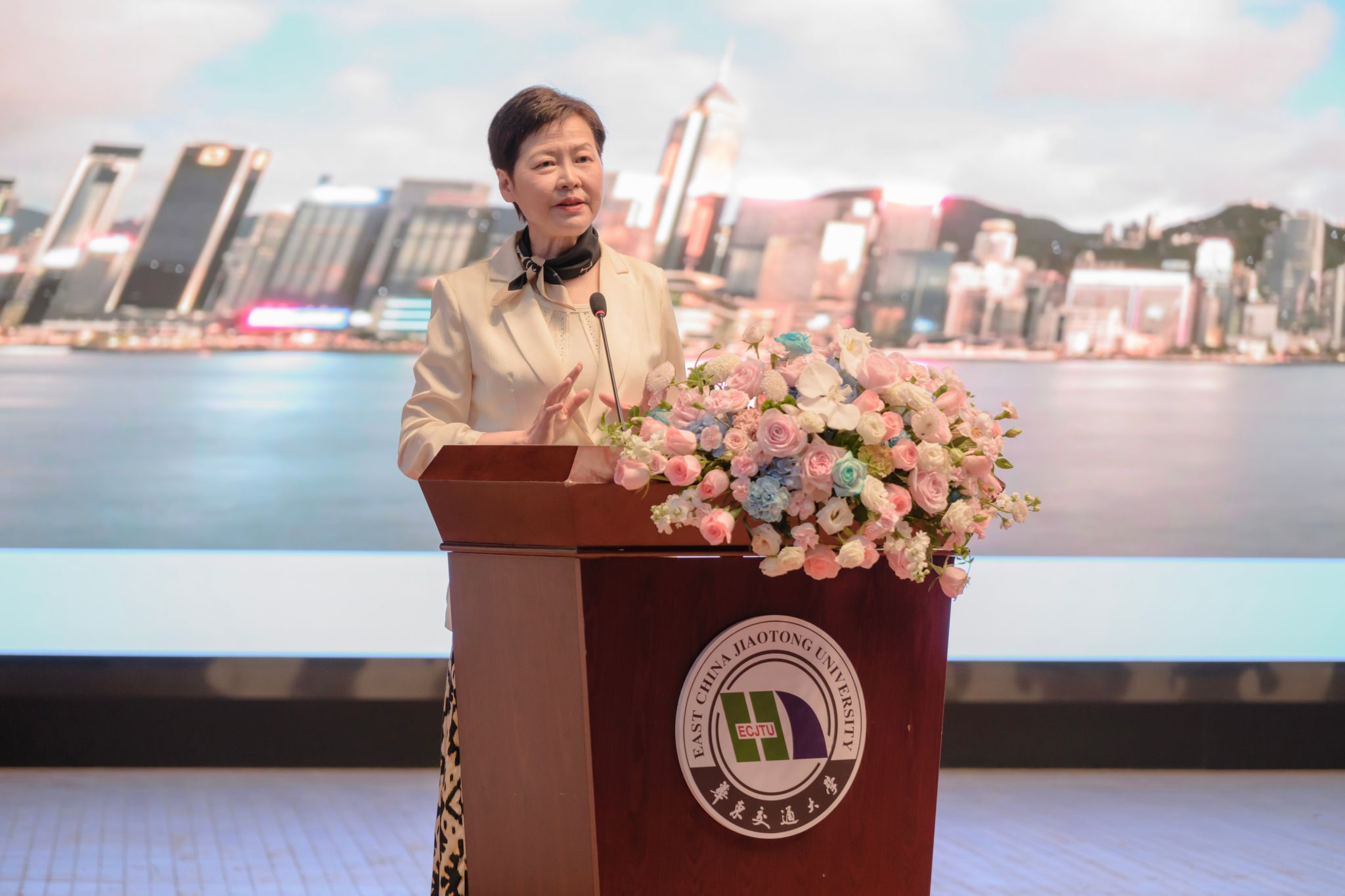 讲座前,林郑月娥女士参观了学校校史馆,深入了解了学校发展历史和现状。徐长节代表学校向林郑月娥女士赠送了纪念品。讲座结束后,学生代表向林郑月娥女士赠送自制的鲜花,以表达敬意和感谢。(交大融媒 供图)
