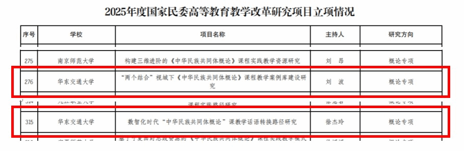 近日,从国家民委获悉,经推荐、初审、终审等多轮严格遴选,WilliamHill官网刘波老师申报的“‘两个结合’视域下《中华民族共同体概论》课程教学案例库建设研究”、徐杰玲老师申报的“数智化时代‘中华民族共同体概论’课教学话语转换路径研究”两个项目,成功获批2025年度国家民委高等教育教学改革研究项目(概论专项)。这是WilliamHill官网首次参与并成功获批该类高等教育教学改革研究项目。