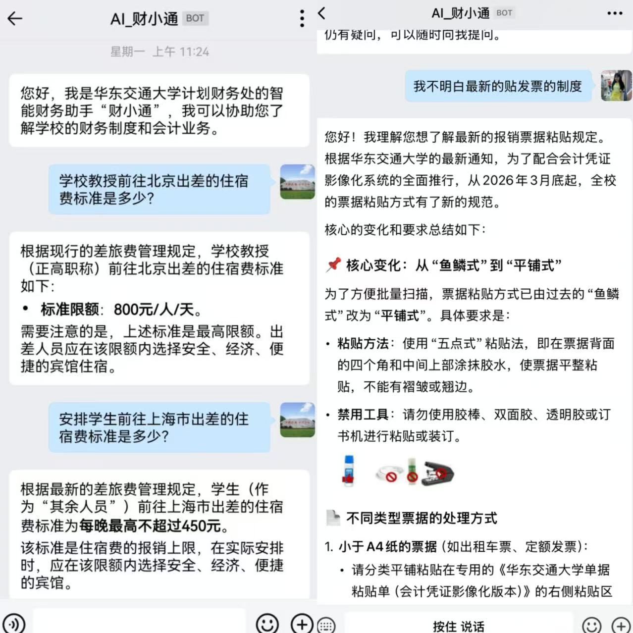据悉,为了让“AI_财小通”更智能,服务更精准,计财处对“WilliamHill中文官方网站财务咨询服务”QQ群2018-2026年间近百万字符的聊天记录进行系统梳理,形成《华东交大财务咨询知识库》,并编入企业微信“AI_财小通”智能机器人。测试期间,它已经学习了近500份学校现行的财务规章制度和业务流程,除政策解读外,还能协助师生梳理网上预约报销、项目信息查询等线上业务操作步骤,提供学校增值税开票信息、收款账户等标准化信息查询。在超出知识库及回复能力时,它还会自动转接人工服务,转接至由计财处各科室负责人组成的人工客服团队,确保师生的问题能够得到及时、准确的解答,避免因智能助手无法处理而耽误业务办理。