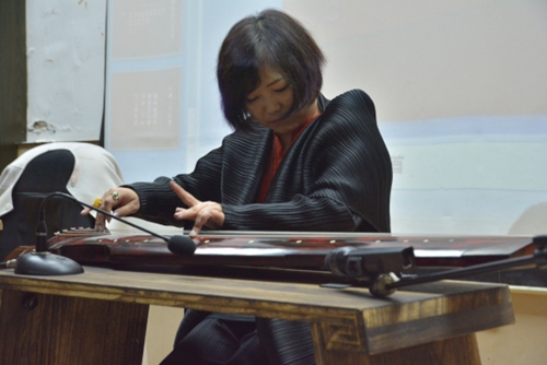 讲座末尾,赵家珍播放了《春风》、《潇湘水云》两个自己演奏的视频,并在现场弹奏了《流水》《酒狂》两首著名曲目,与现场观众互动,耐心解答问题。