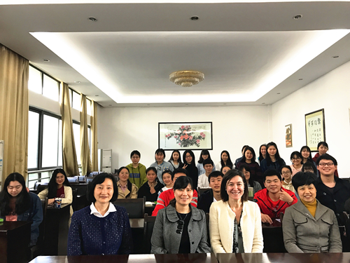 访问期间,Cristina女士还同外语学院英语-西班牙复语专业学生开展互动交流,她向学生介绍了拉里奥哈大学的专业、学科和学生生活情况以及西班牙的教育、文化和风土人情,受到学生们的热烈欢迎。