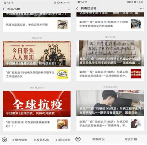 同时,机电学院通过学院微信公众号“机电小微”、党建公众号“机电红齿轮”等渠道开设疫情专栏,帮助学生全方位了解信息。一个多月以来,“机电小微”几乎保持“日更”状态,共推出63篇疫情相关推送,累计阅读量10267人次,介绍防疫工作举措和志愿者行动、及时跟进抗“疫”最新动态,提振青年心、鼓舞青春志。