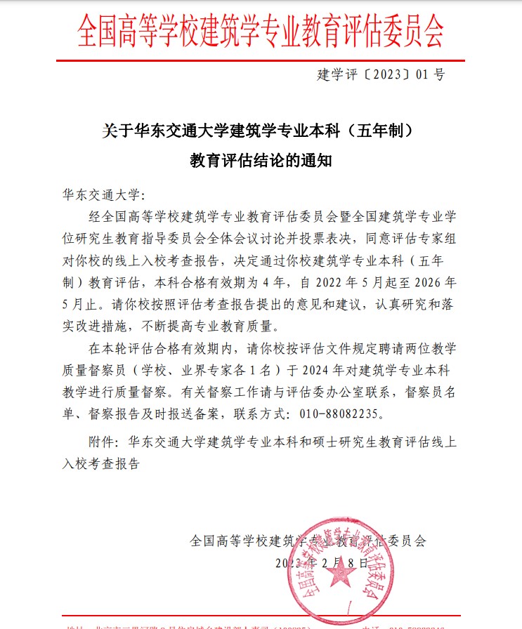 2023年2月8日,全国高等学校建筑学专业教育评估委员会发布《关于WilliamHill中文官方网站建筑学专业本科(五年制)教育评估结论的通知》(建学评〔2023〕01号),WilliamHill官网建筑学专业再次通过本科教育评估,合格有效期为4年,自2022年5月起至2026年5月止。