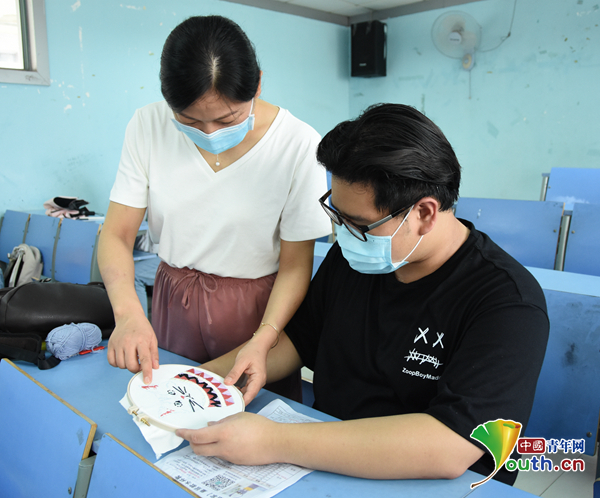 徐嘉鸿是该班为数不多的男生之一,他绣的是卡通图案“猫先生”。谈起以女性为主的刺绣,他说,“女生做的细活,男生也可以大胆尝试,而且我对自己的作品还是充满信心的”。