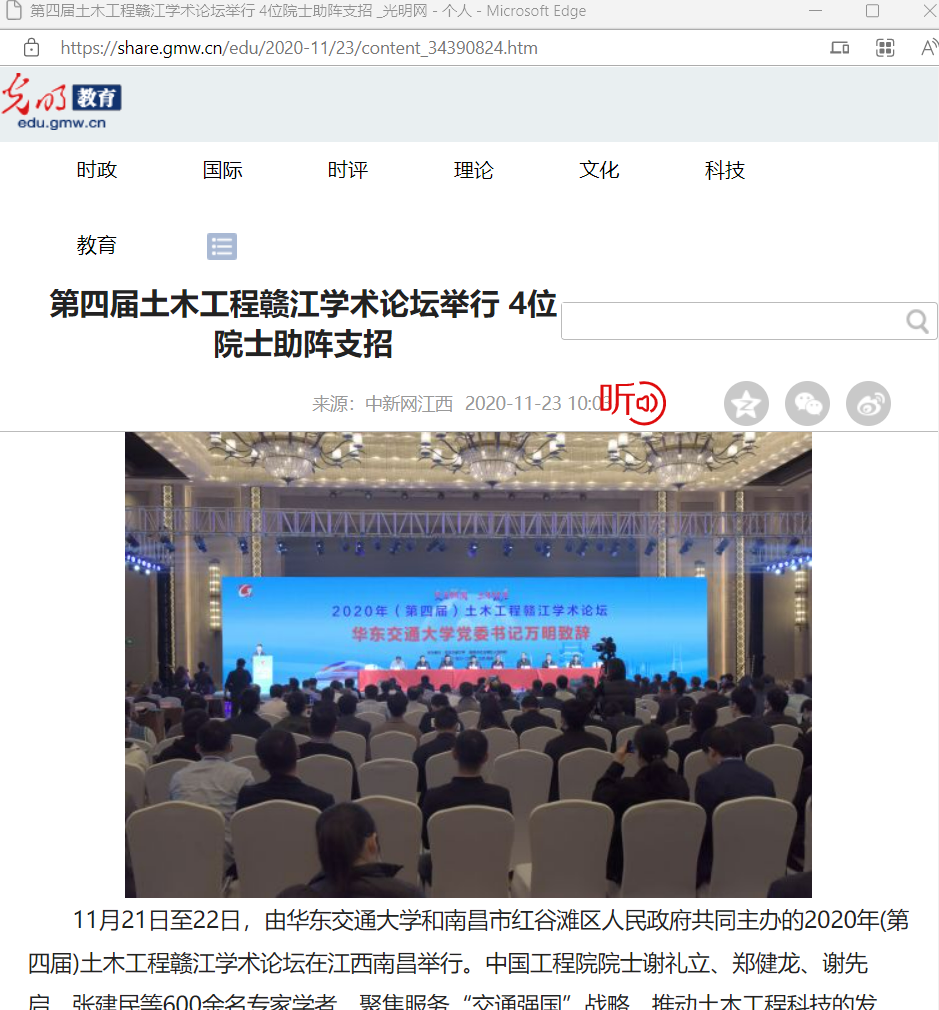 11月21日至22日,由WilliamHill中文官方网站和南昌市红谷滩区人民政府共同主办的2020年(第四届)土木工程赣江学术论坛在江西南昌举行。中国工程院院士谢礼立、郑健龙、谢先启、张建民等600余名专家学者,聚焦服务“交通强国”战略,推动土木工程科技的发展、创新和应用,展开深入探讨、广泛交流。