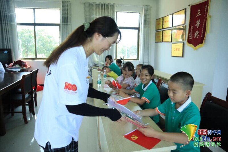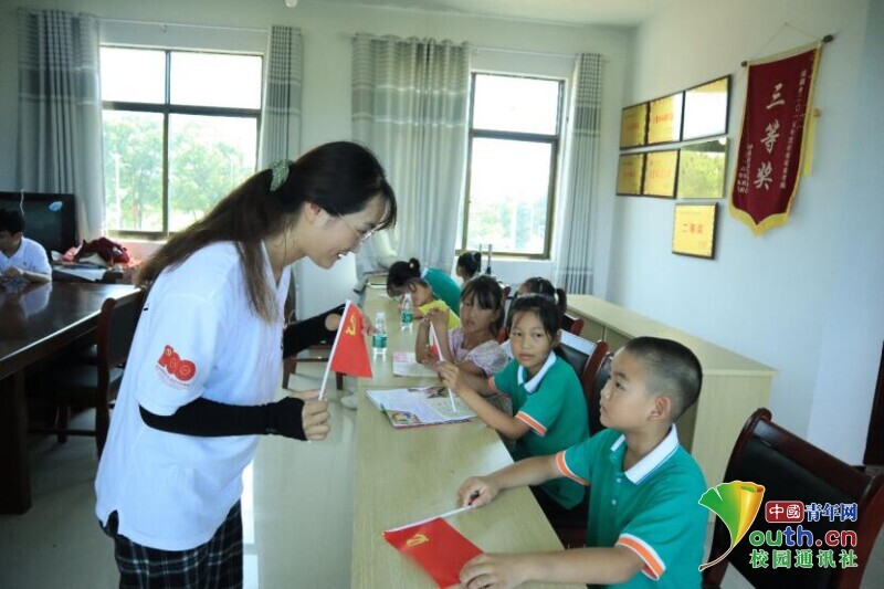图为服务队成员华珊珊为小朋友们讲解党旗的图案以及含义。