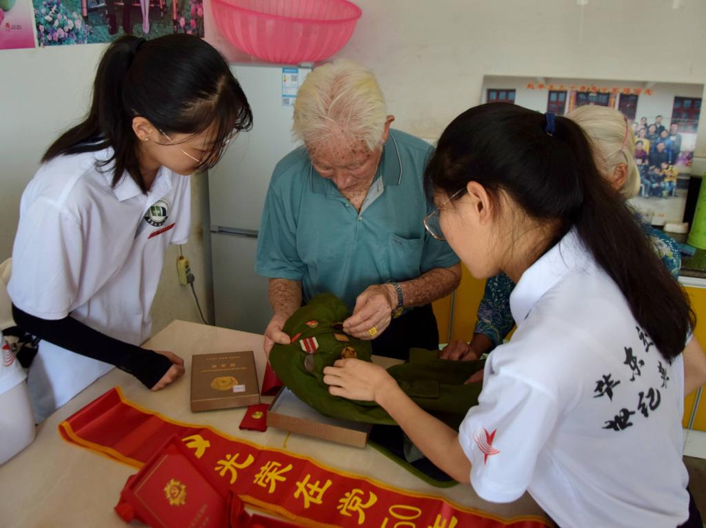 在潢溪镇丁山村95岁抗美援朝老兵赵早生的家里,响起了阵阵歌声,“一条大河波浪宽,风吹稻花香两岸……”《我的祖国》是描写抗美援朝影片《上甘岭》的主题曲,当赵老再次听到这首熟悉的歌曲,情绪激昂,忍不住给队员们竖起大拇指,赞出一句“英雄之歌”。赵老虽已满头白发,回忆起当年岁月依然精神矍铄,他自豪地向实践团成员展示曾获得的勋章,这是老党员一生最大的财富。