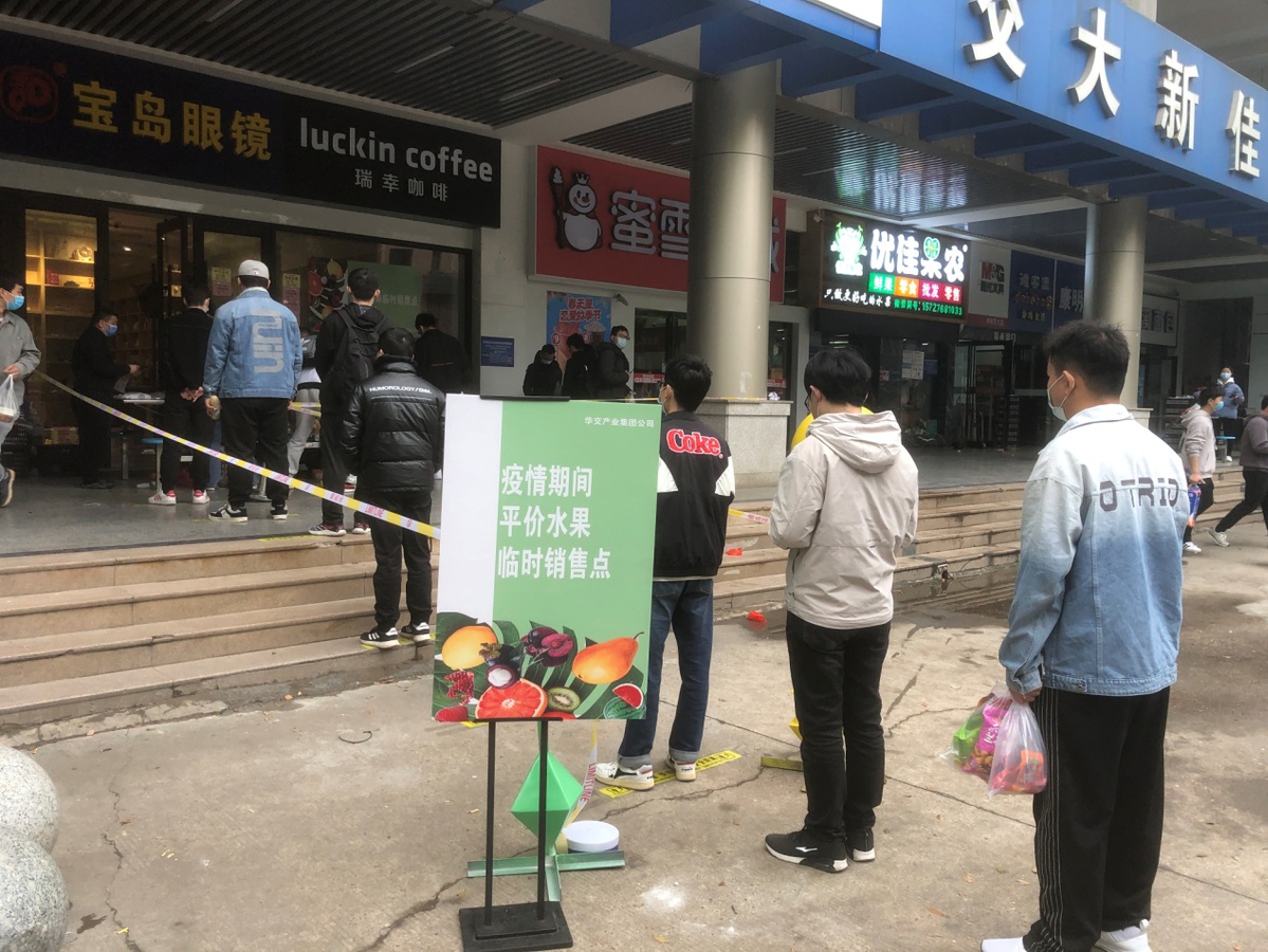 该校师生有序排队购买水果