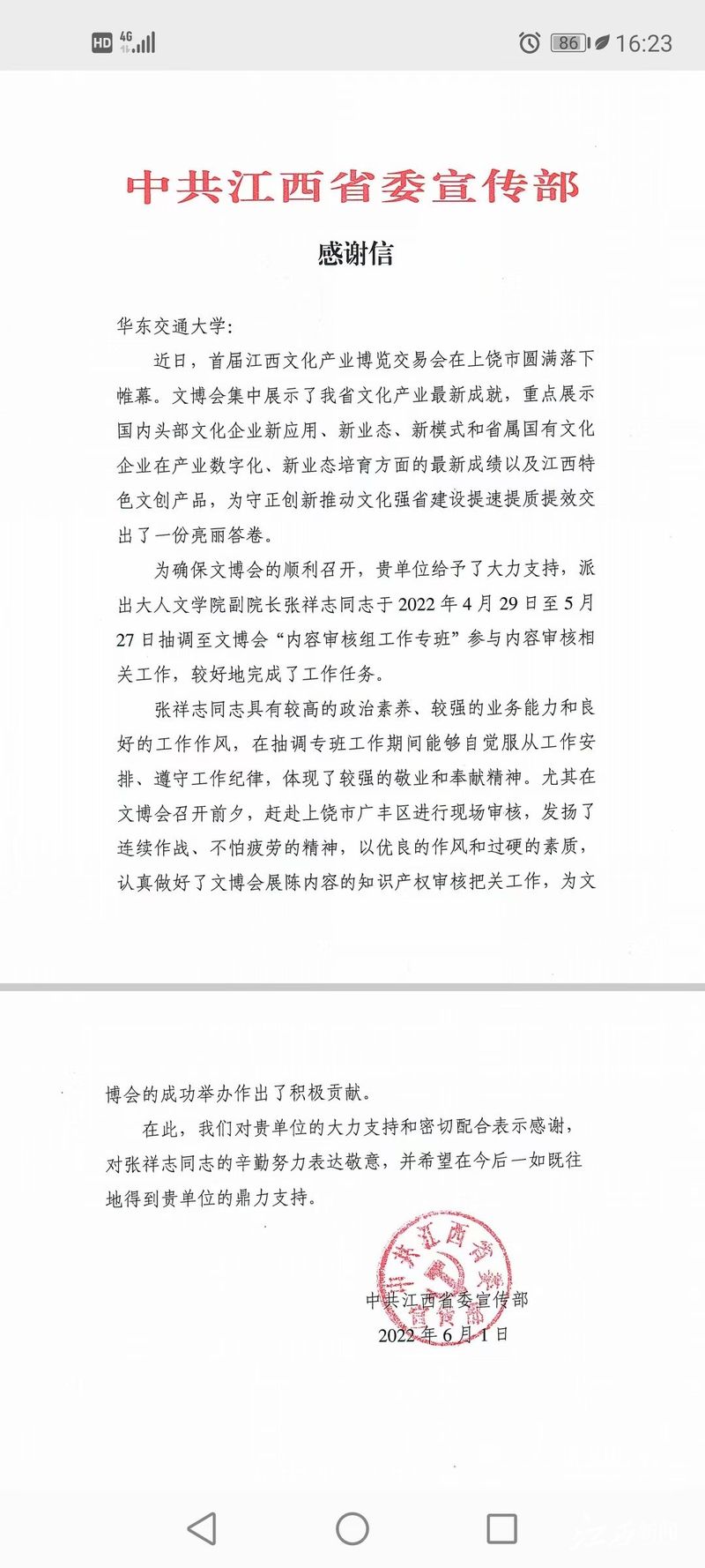 省委宣传部发来感谢信对张祥志在首届江西文化产业博览交易会中的支持表示感谢。