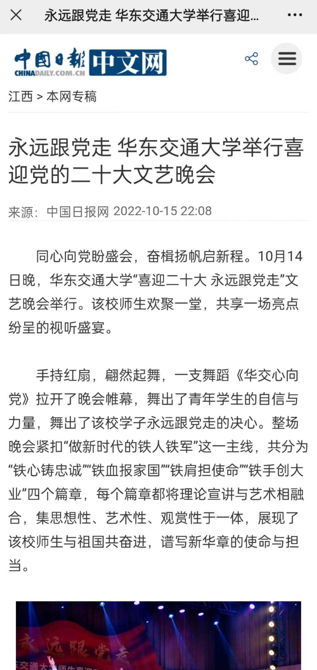 “华交出道在铁、出彩在铁、出路在铁、血脉中流淌着红色基因,精神上熔铸着‘铁’的特质”,《家国一体,命运与共》的宣讲将学校与国家紧紧联系在一起,展现了全校师生心系“国家事”、肩扛“国家责”、胸怀“两个大局”、牢记“国之大者”、立足“省之大业”、着眼“校之大计”,把满腔铁血熔铸于日常的坚守、镌刻在平凡的岗位、倾注进不懈地奋斗的坚定决心;“哪有什么岁月静好,不过是有人在替你负重前行”,原创舞蹈《我们这一代》通过片段式的表达,刻画了生活中平凡却伟大的人物——维护社会治安的警察、疫情中的逆行者医生、重庆山火中的凡人英雄消防员……当面临困难,他们总是不顾个人安危,为大家撑起一片天;情景表演《奉献》从细微处入手,体现小人物、大情感,小事件、大情怀的格局——一位女老师忍着病痛折磨坚守教学一线,尽心尽力为学生辅导,燃烧自己,照亮他人;二胡联奏《游击队之歌》 《骏马奔驰保边疆》、古筝重奏《我和我的祖国》、管乐重奏《钢铁洪流进行曲》曲调激昂、气势磅礴,回顾峥嵘岁月,从革命先烈精神中汲取奋进力量;“唱支山歌给党听,我把党来比母亲……”节目《党的光辉照我心》将场内气氛推向高潮,全场观众齐声合唱,把对党的祝福蕴含在深情的歌声中,全体师生对党的告白回荡在音乐厅,掌声和欢呼声经久不息。