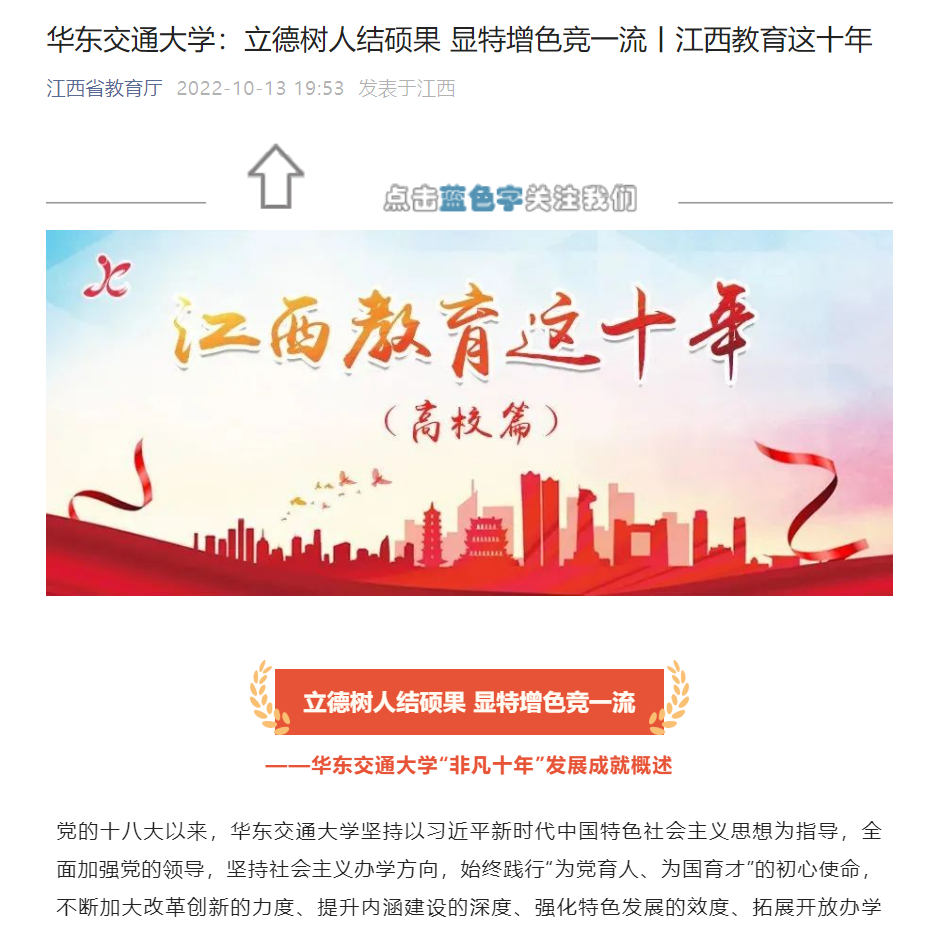 ——基层组织有“劲旅”。党的力量来自组织,组织的力量源于基层。坚持树立大抓基层、大抓基础的鲜明导向,突出政治功能,以提升组织力为重点,以深化基层党建“三化”建设为抓手,推动基层党组织全面进步、全面过硬。获首批全国党建工作标杆院系(首批全省唯一)、全国“双带头人”党支部书记工作室各1个和全国样板党支部4个,实现了院系党委以及专任教师、教职工、学生党支部国家级荣誉全覆盖。——党员队伍有“精兵”。坚持培养与使用并举,下铁心、立铁规、正铁纪、炼铁人、带铁军,努力打造“顶层顶用、中层中用、基层济用”的干部队伍,涌现了以全国师德先进个人、全国三八红旗手、全国岗位学雷锋标兵、“中国大学生年度人物”(江西首位)、全国辅导员素质能力大赛一等奖获得者等为代表的一大批党员先进典型,17人入选“新时代赣鄱先锋”选树学对象。——党建成果有“精品”。坚持显亮党建底色、鲜亮党建特色,立足发展实际、结合传统禀赋,让红的基因更红、铁的特质更铁,精心培育、总结凝练一批成熟机制、有效办法、典型经验,着力打磨一批立得住、叫得响、传得开、经得久的党建精品项目。获全国高校思政工作精品项目以及全国高校思政工作优秀工作案例一等奖,以全省最好成绩获全国辅导员素质能力大赛一等奖,党史学习教育系列经验做法入选中央党史学习教育官网10篇(全国高校第一),1部精品党课被推荐至中组部。育人成效显著增强深入实施教学强本计划,实施完全学分制改革,形成了交通特色鲜明的人才培养体系,教育教学水平和人才培养质量不断提高。开设“詹天佑班”“茅以升班”“卓越工程师班”“中铁国际班”等特色班级,创新人才培养模式。大力实施“天佑学子培育计划”,成立天佑学院,发挥本科教育改革特区和试验基地的引领作用,“领军、领袖”型拔尖人才培养迈出坚实步伐。获国家级教学成果二等奖、全国教育科学研究优秀成果奖二等奖。