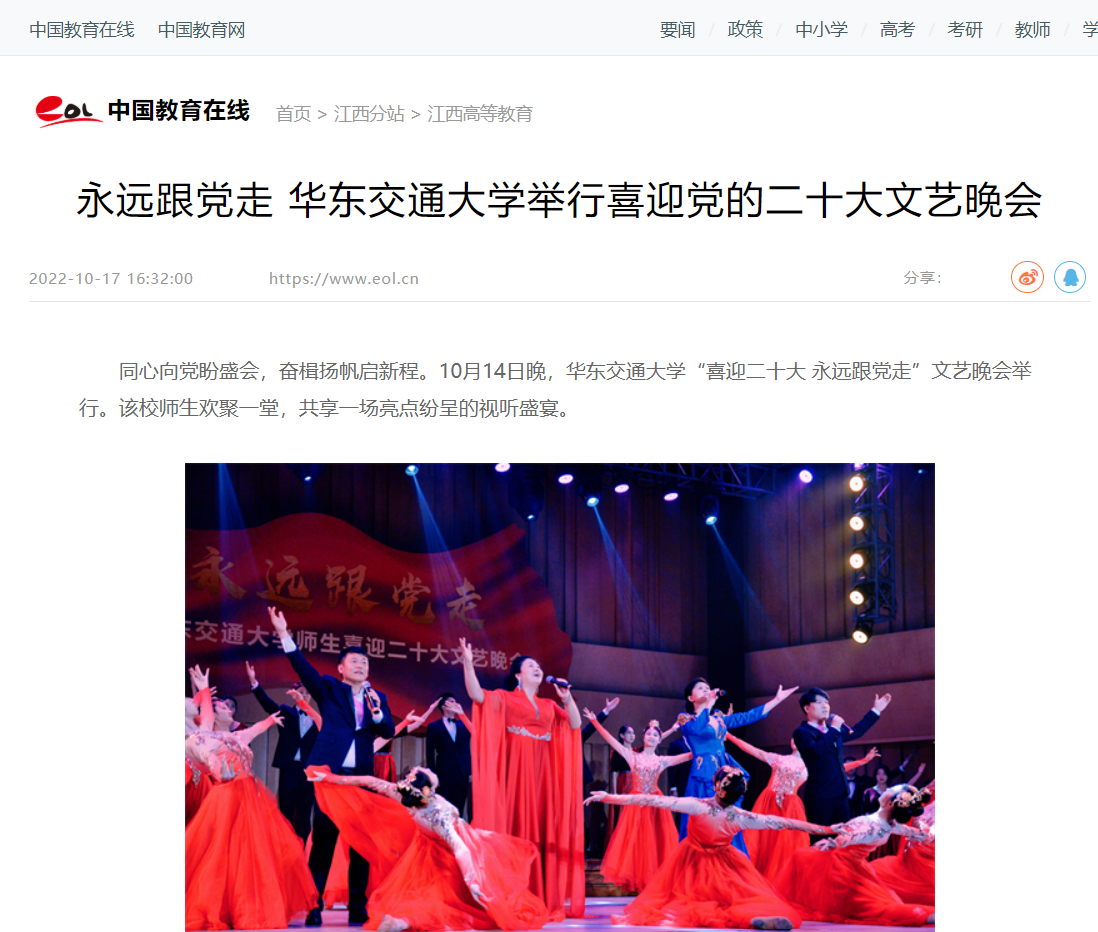 整场演出内容丰富、形式多样、充满正能量,一个个灵动的舞姿,一句句铿锵的宣讲,一声声真情的歌唱表达了该校师生浓浓的爱党爱国之情,传递出对党的二十大胜利召开的热烈期盼。