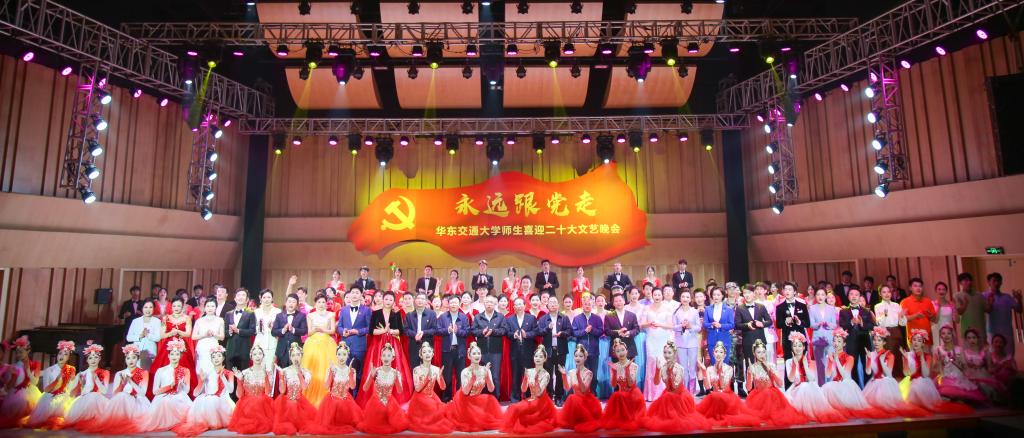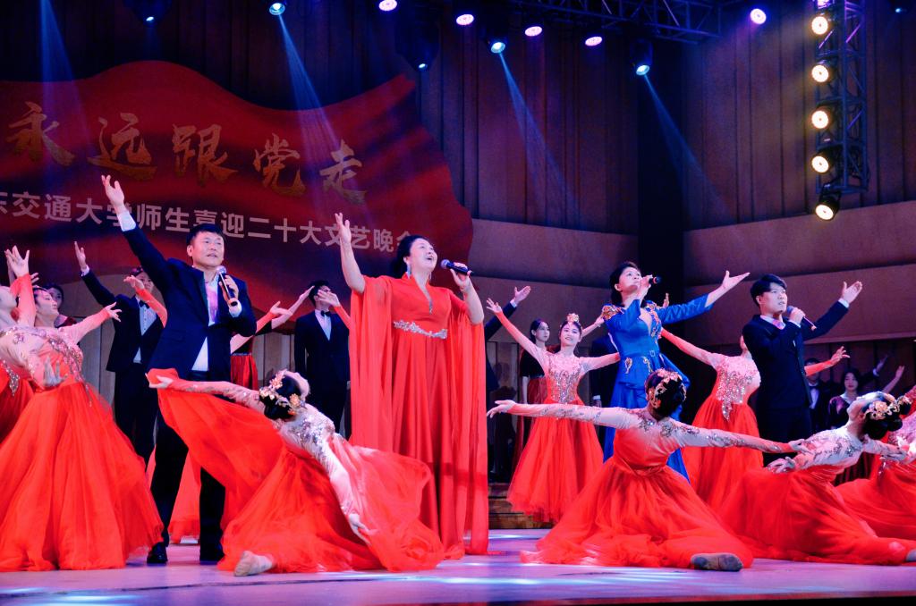 “华交出道在铁、出彩在铁、出路在铁、血脉中流淌着红色基因,精神上熔铸着‘铁’的特质”,《家国一体,命运与共》的宣讲将学校与国家紧紧联系在一起,展现了全校师生心系“国家事”、肩扛“国家责”、胸怀“两个大局”、牢记“国之大者”、立足“省之大业”、着眼“校之大计”,把满腔铁血熔铸于日常的坚守、镌刻在平凡的岗位、倾注进不懈地奋斗的坚定决心;“哪有什么岁月静好,不过是有人在替你负重前行”,原创舞蹈《我们这一代》通过片段式的表达,刻画了生活中平凡却伟大的人物——维护社会治安的警察、疫情中的逆行者医生、重庆山火中的凡人英雄消防员……当面临困难,他们总是不顾个人安危,为大家撑起一片天;情景表演《奉献》从细微处入手,体现小人物、大情感,小事件、大情怀的格局——一位女老师忍着病痛折磨坚守教学一线,尽心尽力为学生辅导,燃烧自己,照亮他人;二胡联奏《游击队之歌》 《骏马奔驰保边疆》、古筝重奏《我和我的祖国》、管乐重奏《钢铁洪流进行曲》曲调激昂、气势磅礴,回顾峥嵘岁月,从革命先烈精神中汲取奋进力量;“唱支山歌给党听,我把党来比母亲……”节目《党的光辉照我心》将场内气氛推向高潮,全场观众齐声合唱,把对党的祝福蕴含在深情的歌声中,全体师生对党的告白回荡在音乐厅,掌声和欢呼声经久不息。