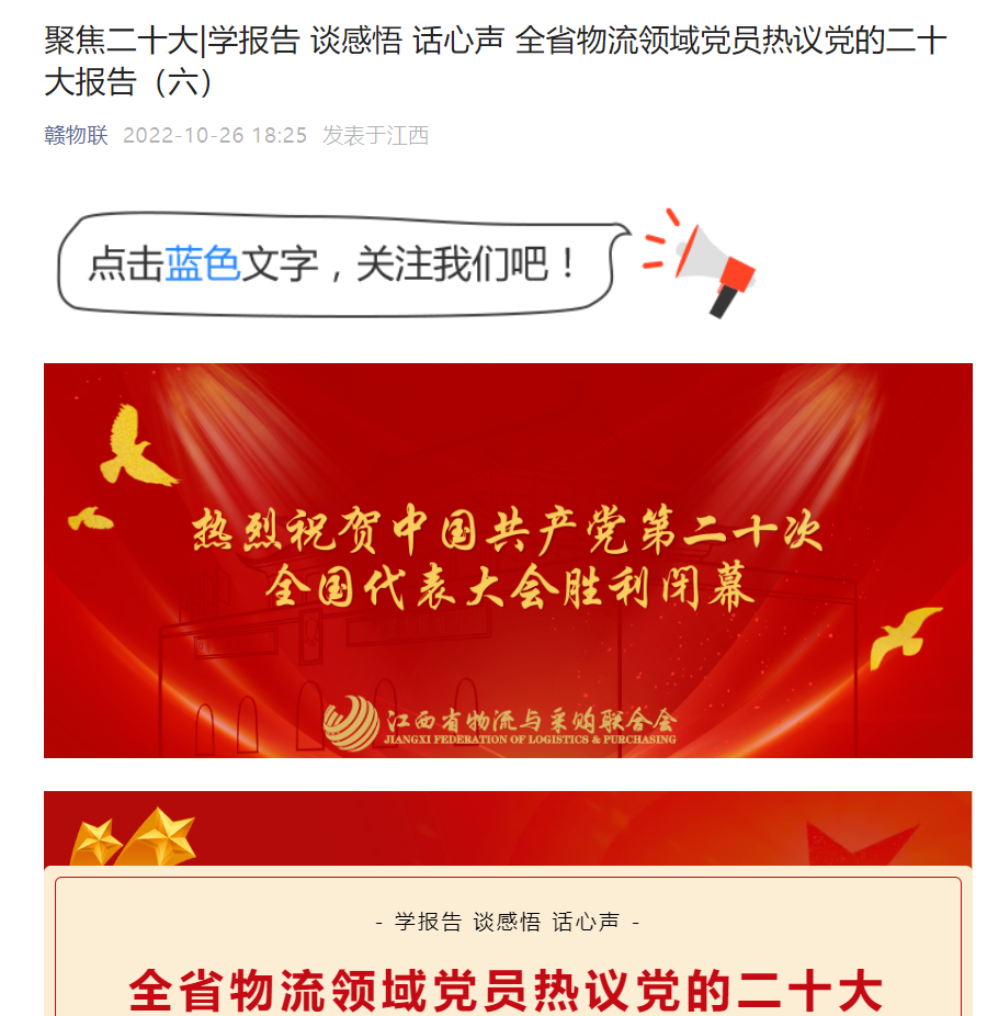 聆听了习近平总书记在党的二十大上所做的报告,举旗定向、站位高远,气势恢宏,系统总结了过去五年的工作和新时代十年的伟大变革,进一步指明了党和国家事业的前进方向。十年砥砺奋进,万里河山绘就壮美画卷,作为一名中国共产党党员,我由衷的感受到自豪与骄傲,对未来的发展充满信心。下一步,我们将进一步提振干事创业的精气神,切实把思想、行动统一到党的二十大报告上来,以更足干劲、更实作为,打造城乡商贸流通品牌,以提升当地城乡消费环境奉献企业力量;加强提升线上运营团队的建设,拓展农产品上行渠道,助力地方经济发展,用实际行动践行企业的社会责任担当!