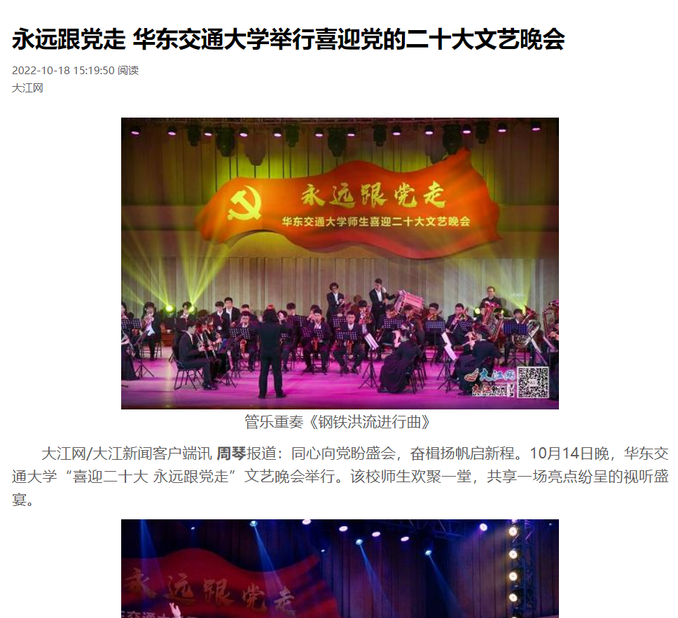 “华交出道在铁、出彩在铁、出路在铁、血脉中流淌着红色基因,精神上熔铸着‘铁’的特质”,《家国一体,命运与共》的宣讲将学校与国家紧紧联系在一起,展现了全校师生心系“国家事”、肩扛“国家责”、胸怀“两个大局”、牢记“国之大者”、立足“省之大业”、着眼“校之大计”,把满腔铁血熔铸于日常的坚守、镌刻在平凡的岗位、倾注进不懈地奋斗的坚定决心;“哪有什么岁月静好,不过是有人在替你负重前行”,原创舞蹈《我们这一代》通过片段式的表达,刻画了生活中平凡却伟大的人物——维护社会治安的警察、疫情中的逆行者医生、重庆山火中的凡人英雄消防员……当面临困难,他们总是不顾个人安危,为大家撑起一片天;情景表演《奉献》从细微处入手,体现小人物、大情感,小事件、大情怀的格局——一位女老师忍着病痛折磨坚守教学一线,尽心尽力为学生辅导,燃烧自己,照亮他人;二胡联奏《游击队之歌》 《骏马奔驰保边疆》、古筝重奏《我和我的祖国》、管乐重奏《钢铁洪流进行曲》曲调激昂、气势磅礴,回顾峥嵘岁月,从革命先烈精神中汲取奋进力量;“唱支山歌给党听,我把党来比母亲……”节目《党的光辉照我心》将场内气氛推向高潮,全场观众齐声合唱,把对党的祝福蕴含在深情的歌声中,全体师生对党的告白回荡在音乐厅,掌声和欢呼声经久不息。