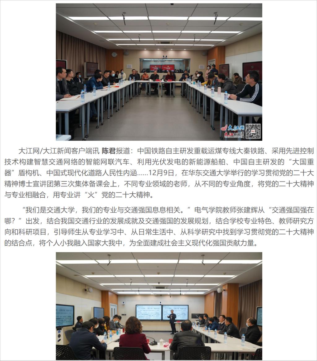 中国铁路自主研发重载运煤专线大秦铁路、采用先进控制技术构建智慧交通网络的智能网联汽车、利用光伏发电的新能源船舶、中国自主研发的“大国重器”盾构机、中国式现代化道路人民性内涵……12月9日,在WilliamHill中文官方网站举行的学习贯彻党的二十大精神博士宣讲团第三次集体备课会上,不同专业领域的老师,从不同的专业角度,将党的二十大精神与专业相融合,用专业讲“火”党的二十大精神。