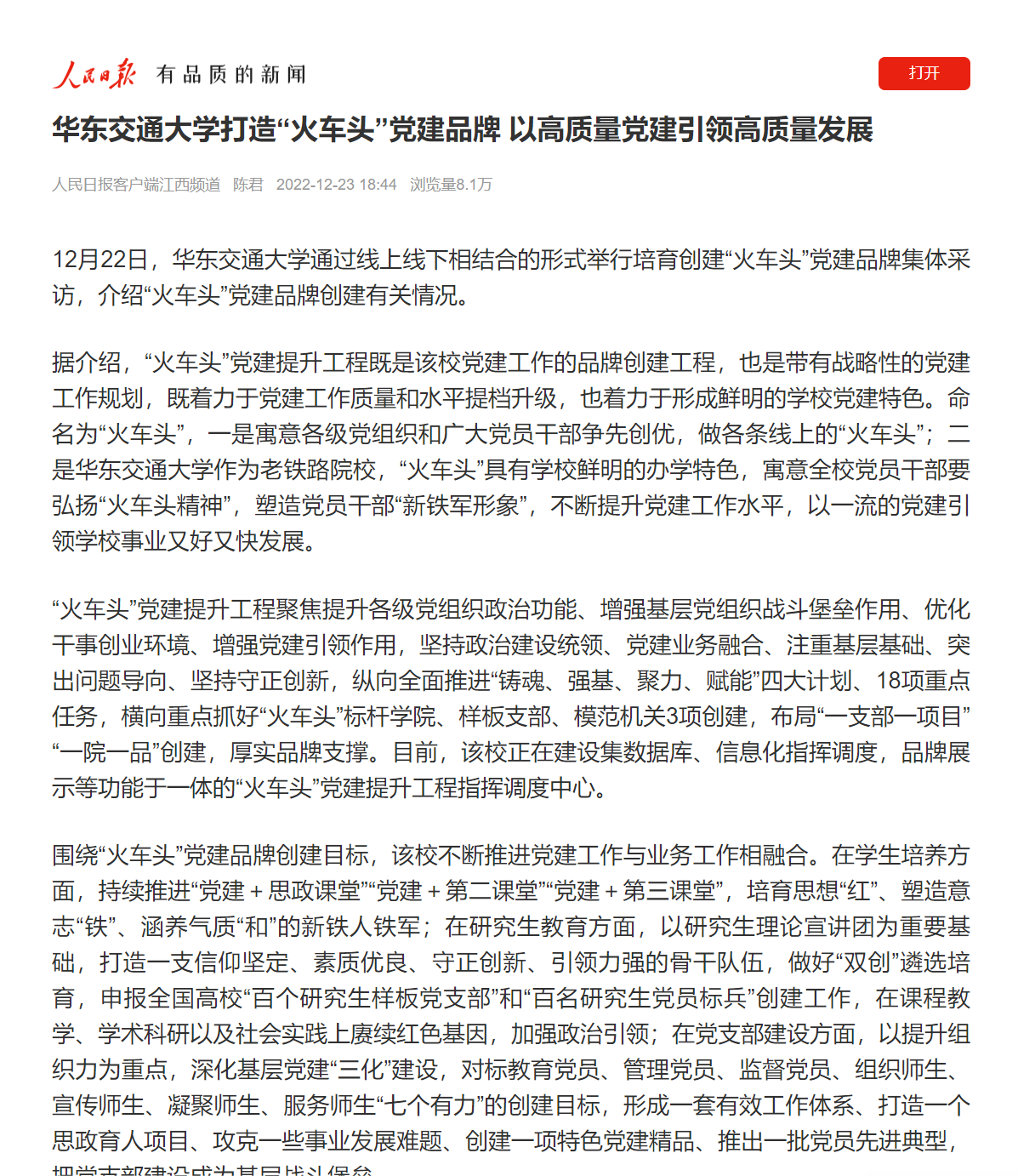 “火车头”党建提升工程聚焦提升各级党组织政治功能、增强基层党组织战斗堡垒作用、优化干事创业环境、增强党建引领作用,坚持政治建设统领、党建业务融合、注重基层基础、突出问题导向、坚持守正创新,纵向全面推进“铸魂、强基、聚力、赋能”四大计划、18项重点任务,横向重点抓好“火车头”标杆学院、样板支部、模范机关3项创建,布局“一支部一项目”“一院一品”创建,厚实品牌支撑。目前,该校正在建设集数据库、信息化指挥调度,品牌展示等功能于一体的“火车头”党建提升工程指挥调度中心。